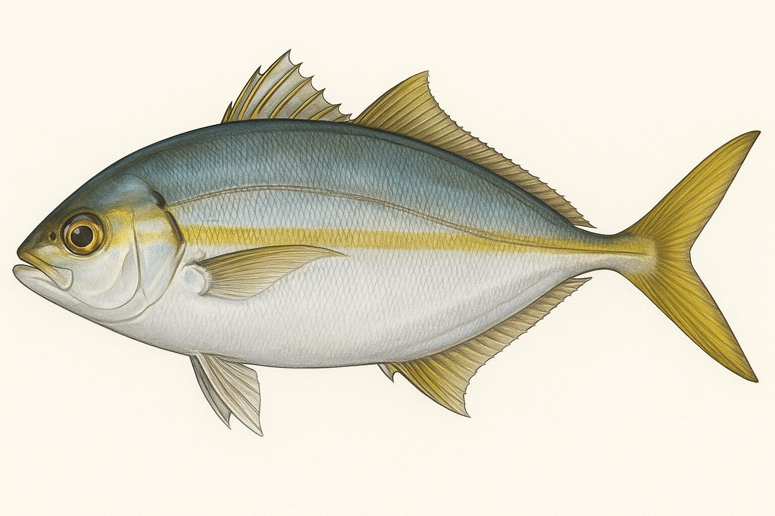 ・外見ディテール。ブリは体側の黄色帯が背側寄りに走る。シマアジは体中央を通る鮮明な黄色帯。