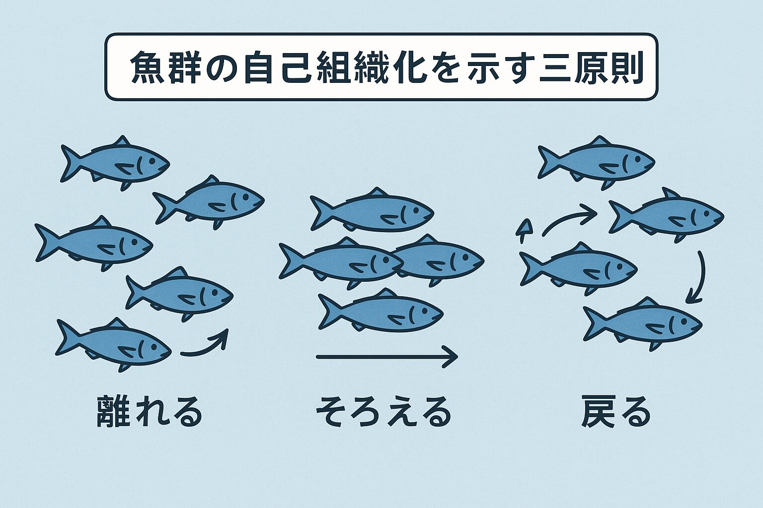 群れはリーダーの号令で動くのではなく。各個体の単純ルールの積み重ねで形づくられます。