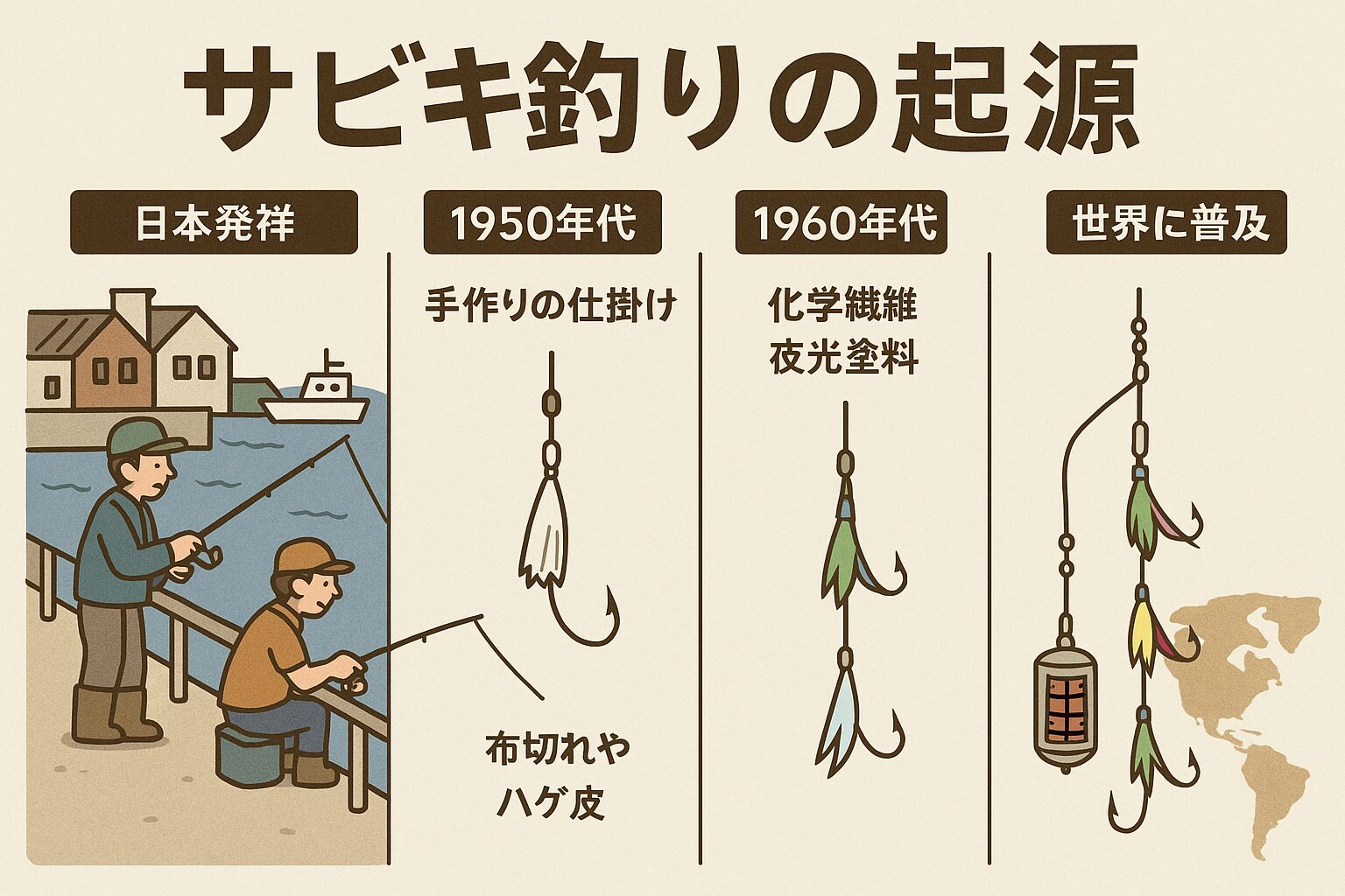 サビキ釣りの起源はどこ?いつ誕生した?戦後の日本で庶民に広まった「コマセ+疑似エサ仕掛け」の歴史を、初心者にもわかりやすく解説します。