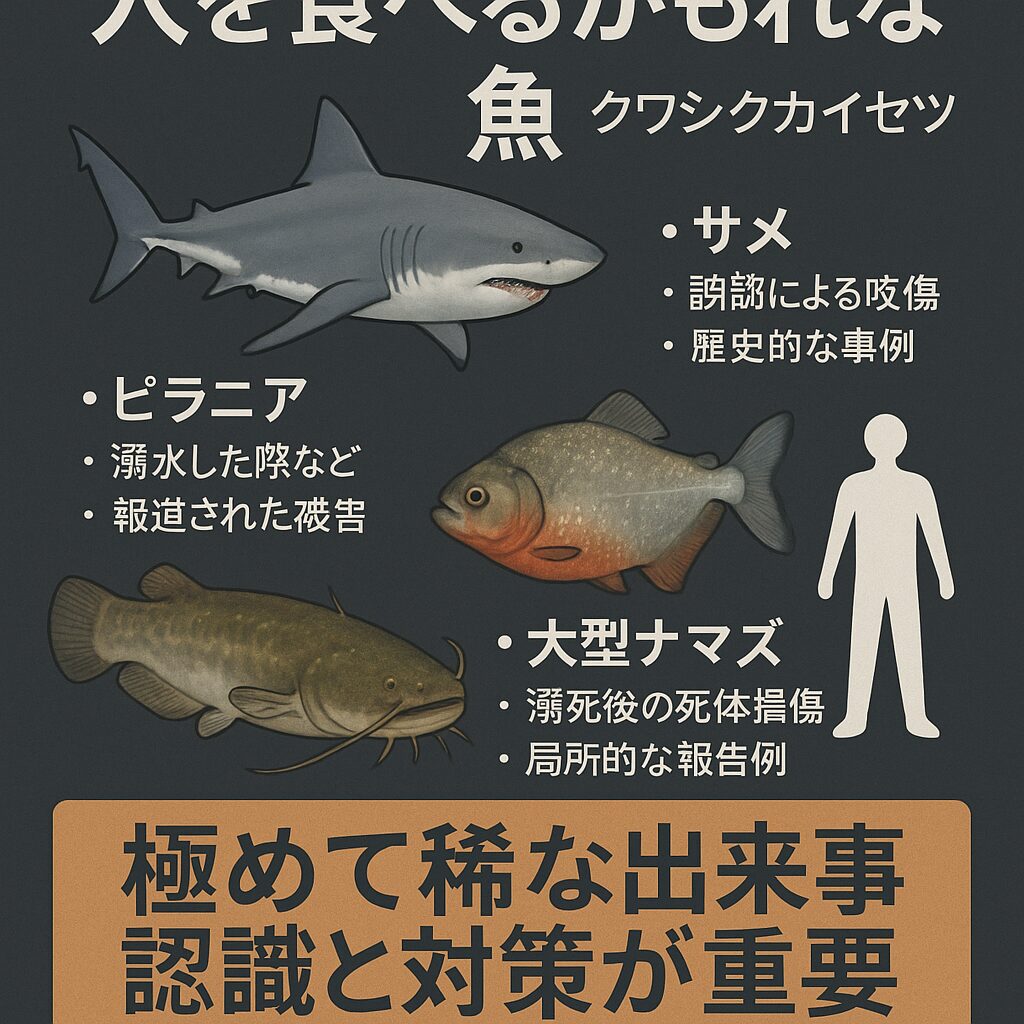 「人を食べるかもしれない魚」は確かに存在するが、日常的に人を狙って襲う種は少数であり、多くは特殊な状況(溺死・血や興奮・大量群れ)で起きる例が多いです。