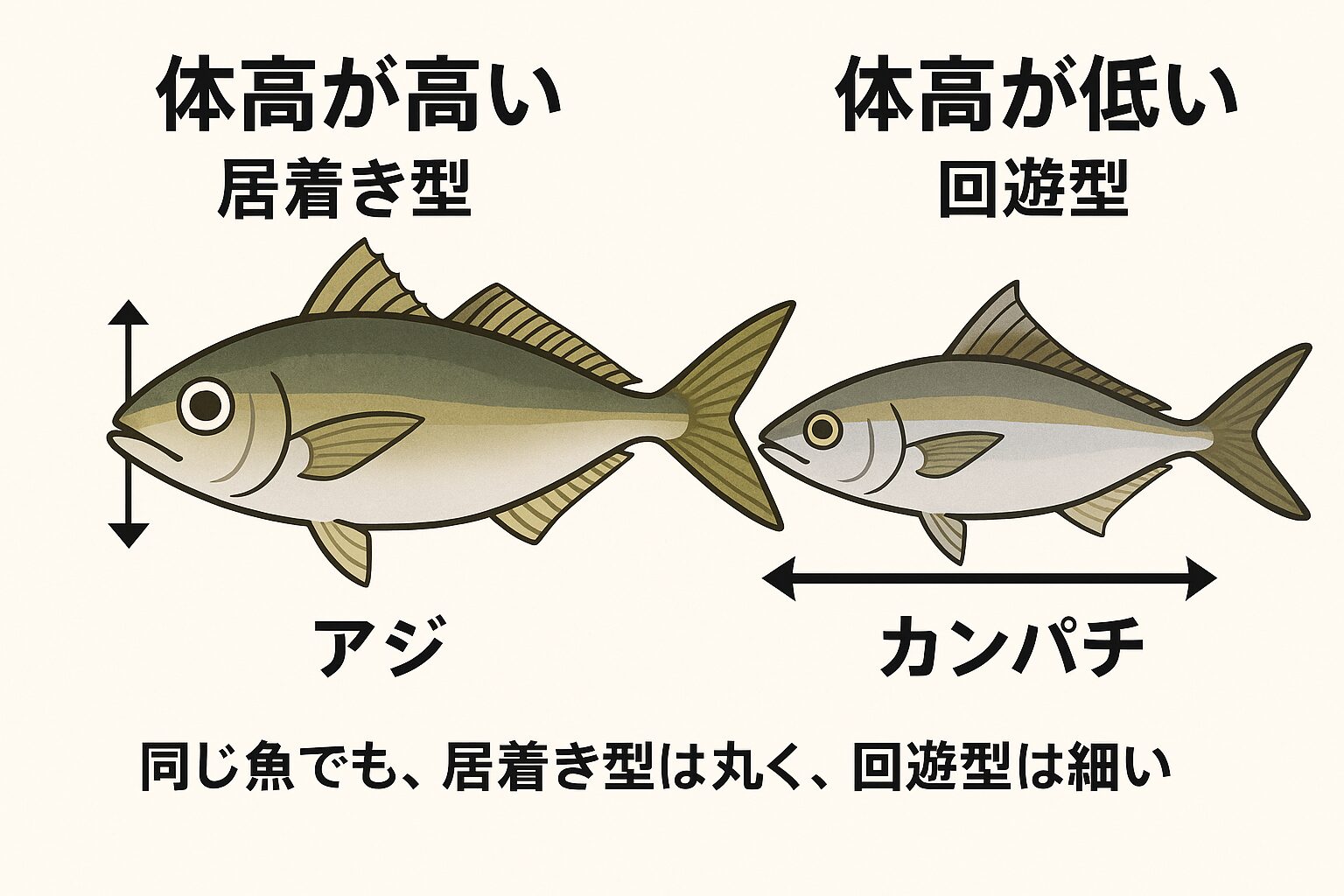多くの魚で体高差が生じる主な理由は、「回遊型」と「居着き型」の違いです。