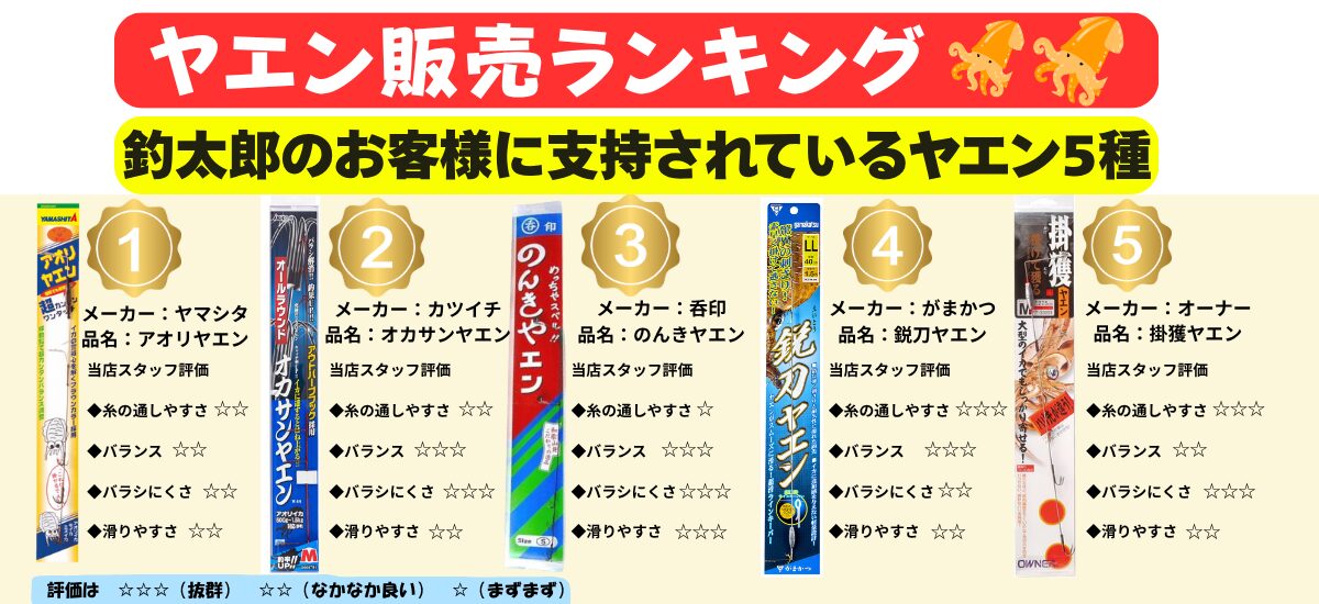 ・釣太郎で最も売れているヤエンは「ヤマシタ アオリヤエン」