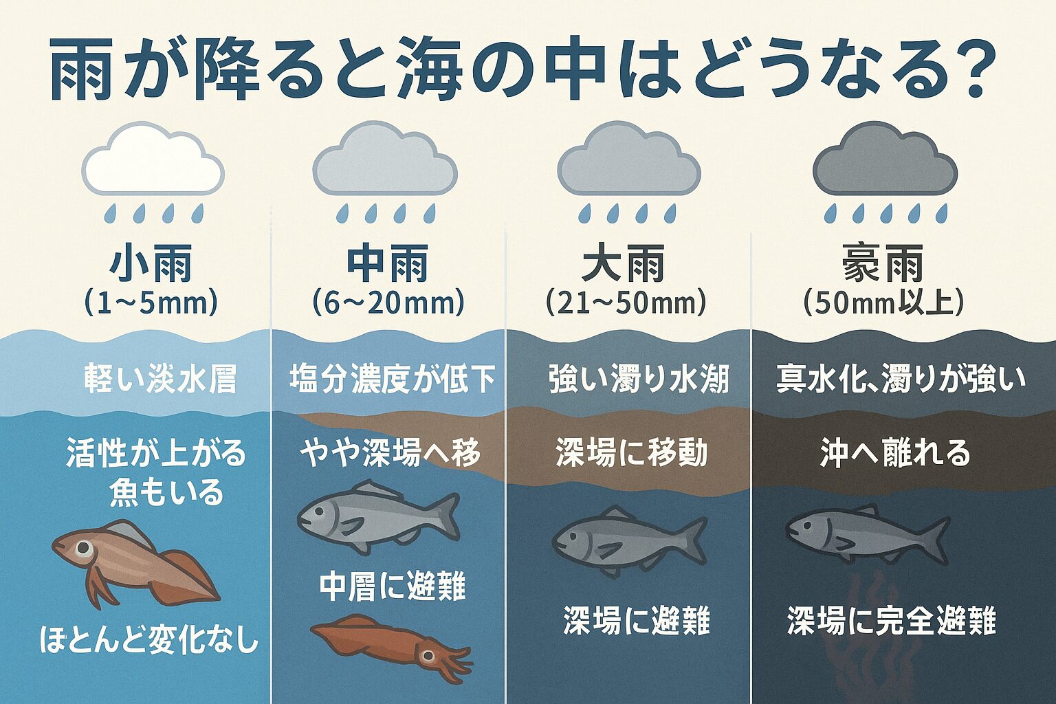 今回は、雨量別に海の中がどう変化するのか、そして魚やアオリイカの反応と回復時間をわかりやすく一覧表で紹介します。