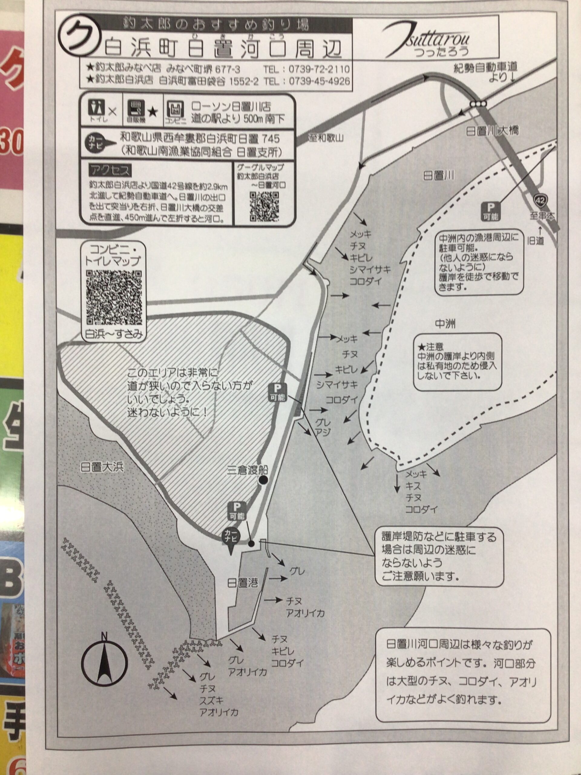日置川河口の護岸は川全体の底は、橋の下までほとんど海と同じ。赤丸周辺ではアオサで巨グレが狙える。…夕方で満ち潮時が狙い目。