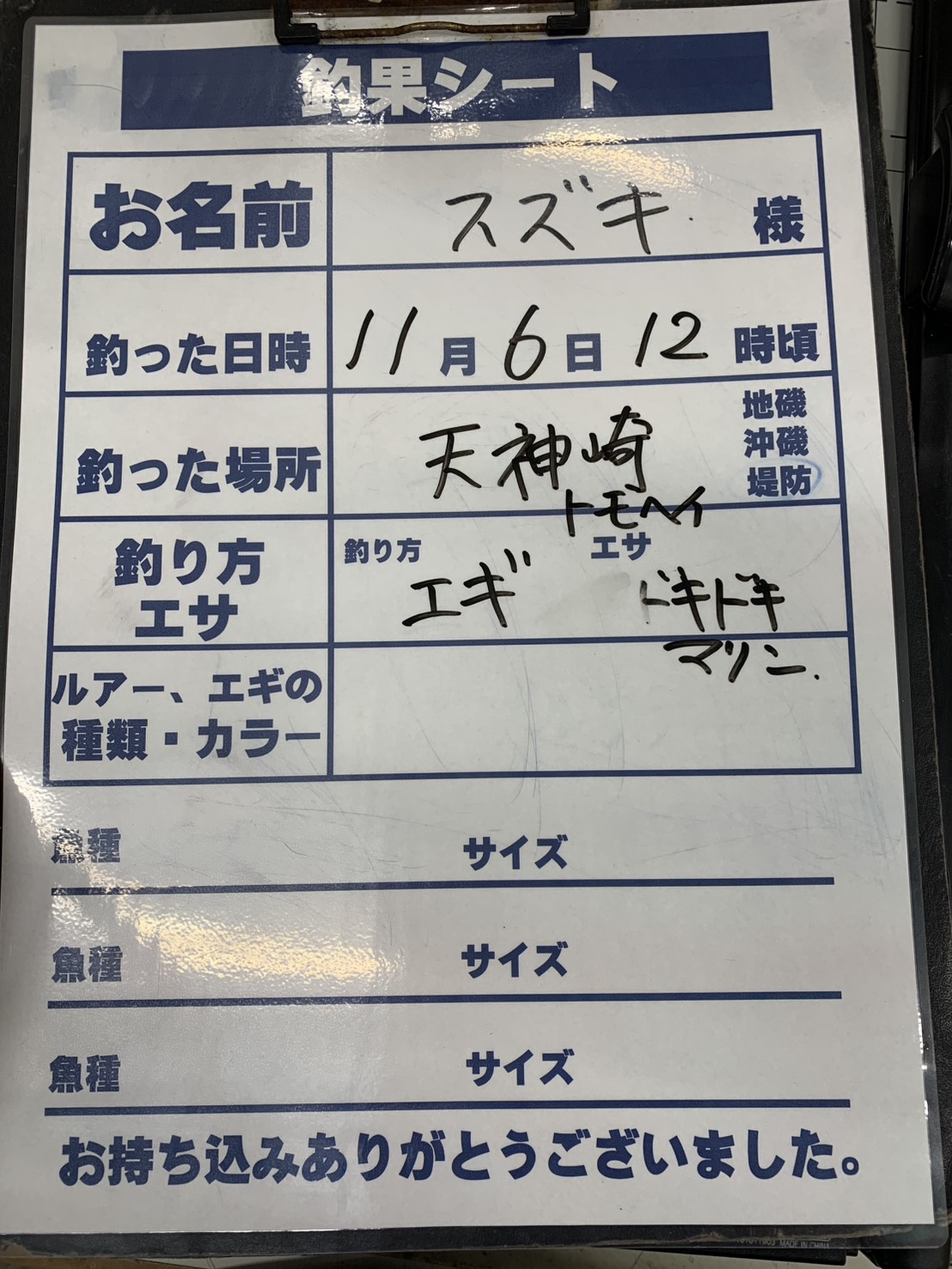 11/6 アオリイカの釣果3杯で530g 天神崎トモヘイでエギング、エギ王ドキドキマリン!