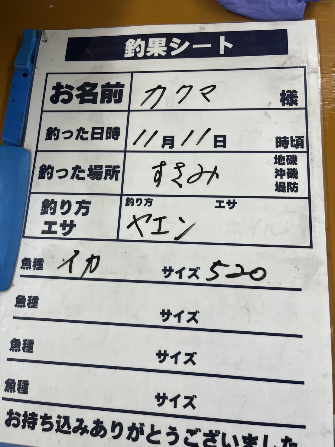 11/12 アオリイカの釣果 520g 釣り場すさみ、ヤエン釣りにて