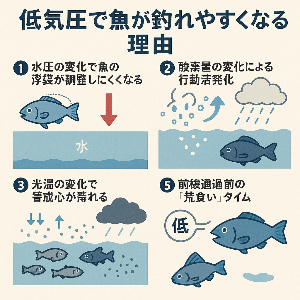気圧・水中酸素・光量・気温など、環境変化が魚の行動を活発化させるためです。
