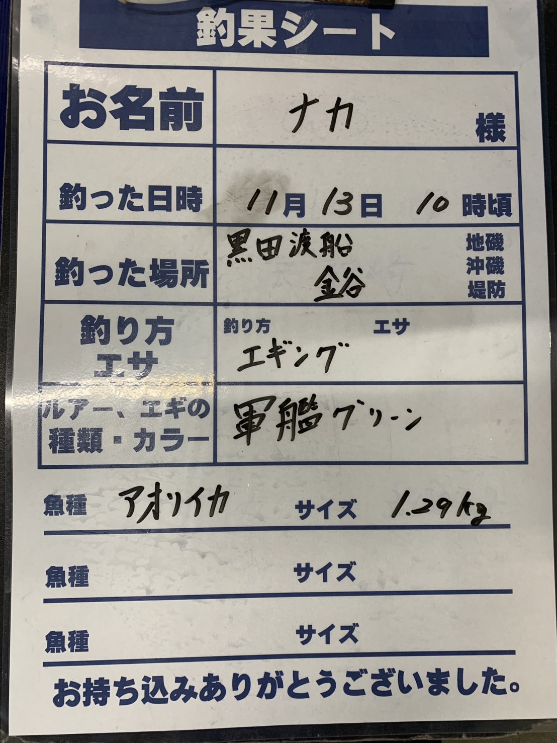 11/13 アオリイカの釣果1290g 黒田渡船・金谷、エギング軍艦グリーンにて