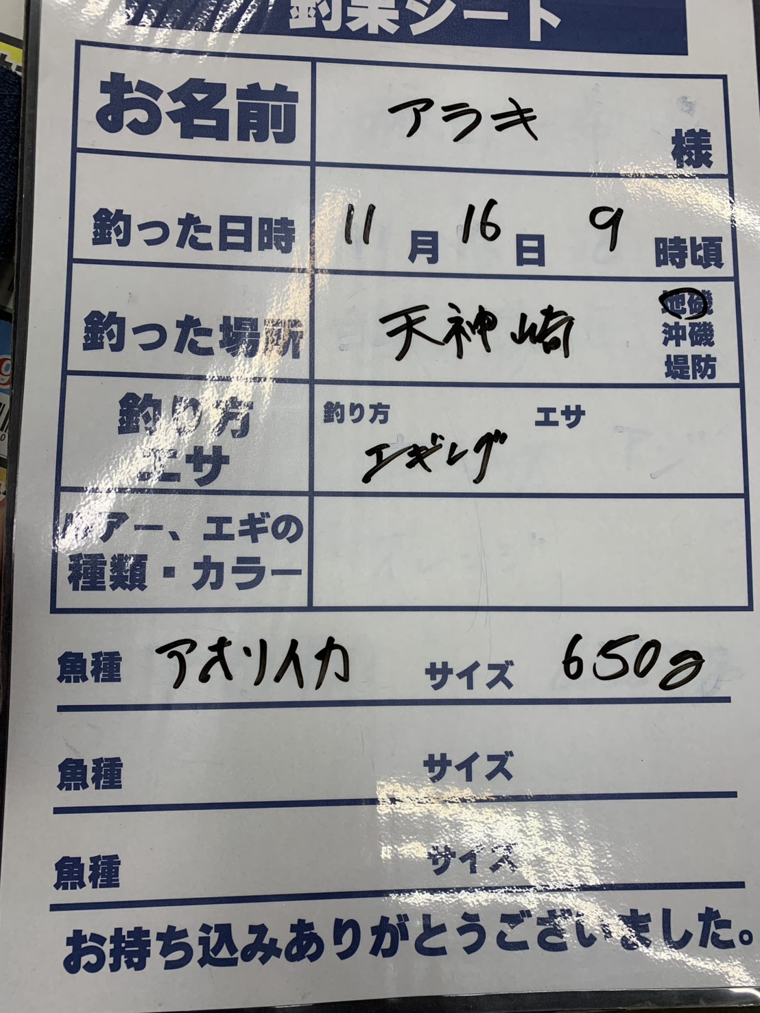 11/16 アオリイカの釣果650g 天神崎、エギングにて