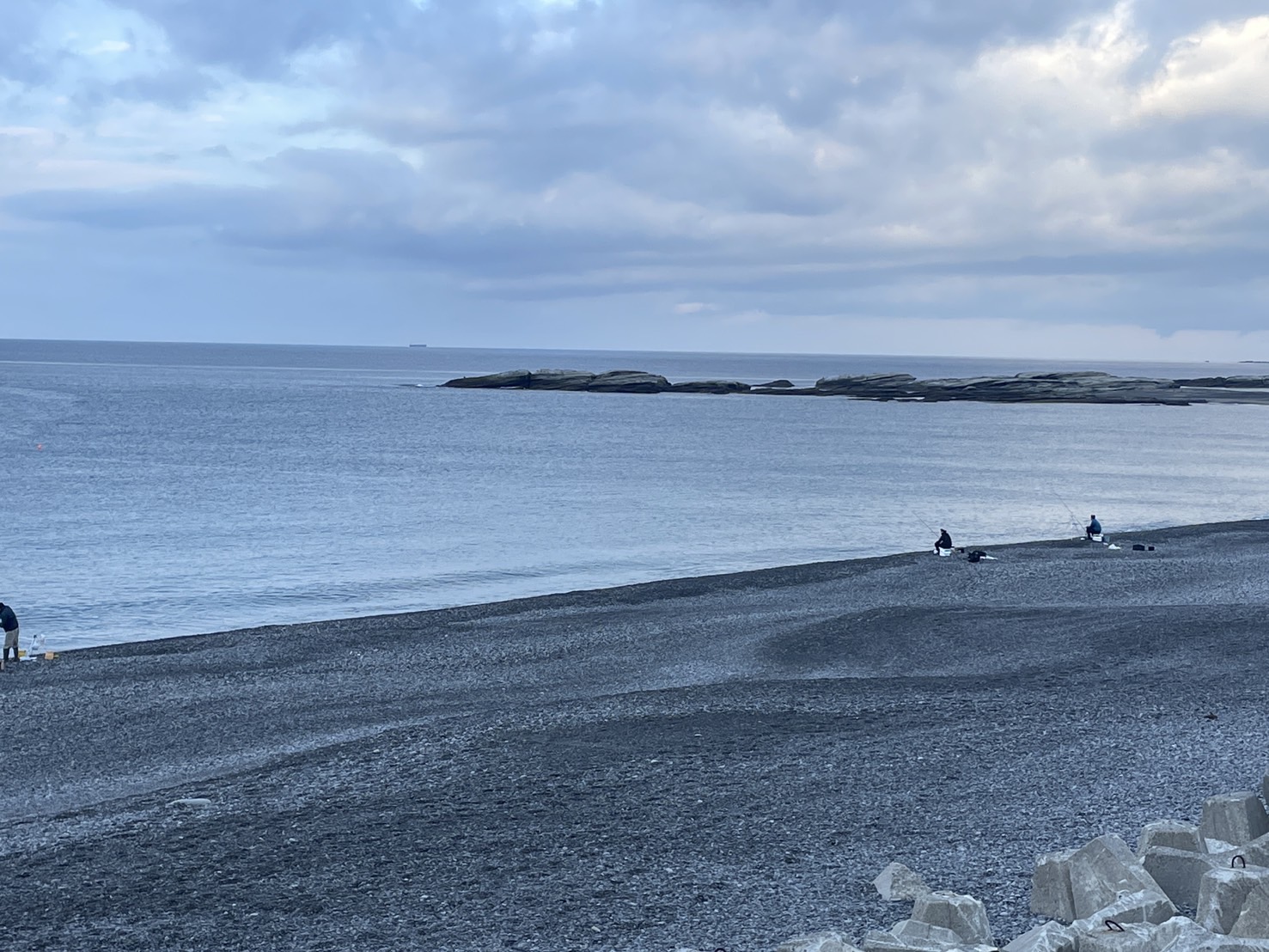 白浜富田(とんだ)浜の様子。 パラパラと10人ほどが シマアジを釣っています。