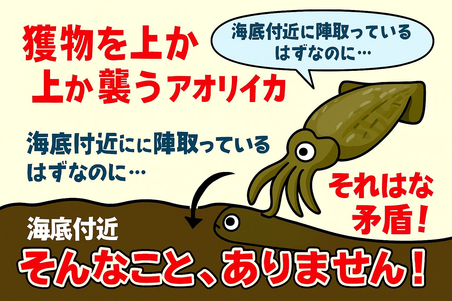 アオリイカは海底付近に潜みながら、獲物を“上から押さえ込む”ように襲う習性を持っています。つまり「待ち伏せ型+上から捕食型」という二面性が釣り攻略の鍵です。