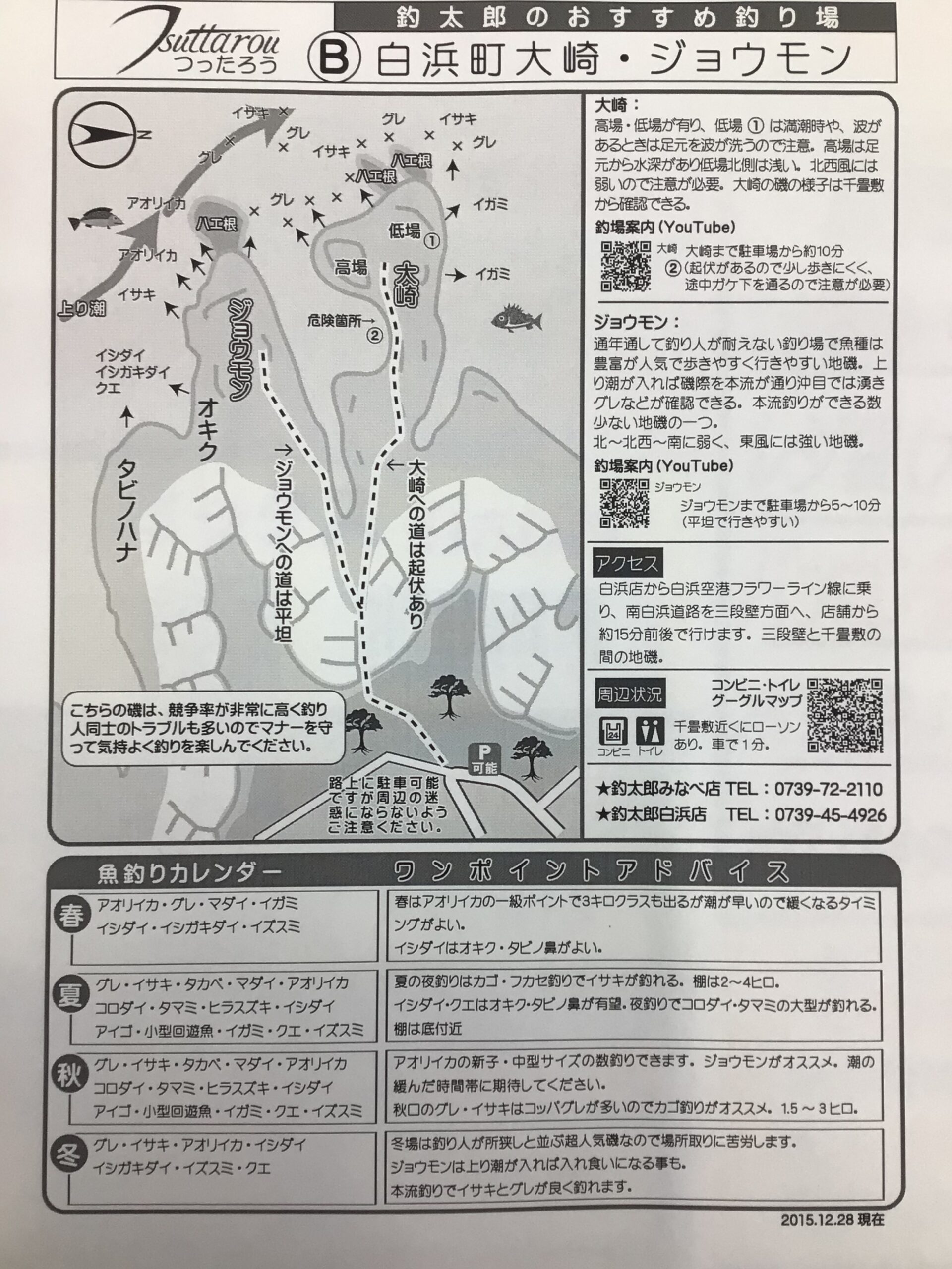 一度は行ってみたい。白浜町人気の地磯。 ピックアップ 2025.11.19 大崎 高場・低場が有り、低場①は満潮時や、波があるときは足元を波が洗うので注意。高場は足元から水深があり低場北側は浅い。北西風には弱いので注意が必要。大崎の磯の様子は千畳敷から確認できる。 ジョウモン 年間通して釣り人が耐えない釣り場で魚種は豊富が人気で歩きやすく行きやすい地磯。上り潮が入れば磯際を本流が通り沖目では湧きグレなどが確認できる。本流釣りができる数少ない地磯の一つ。 北~北西~南に弱く、東風には強い地磯。