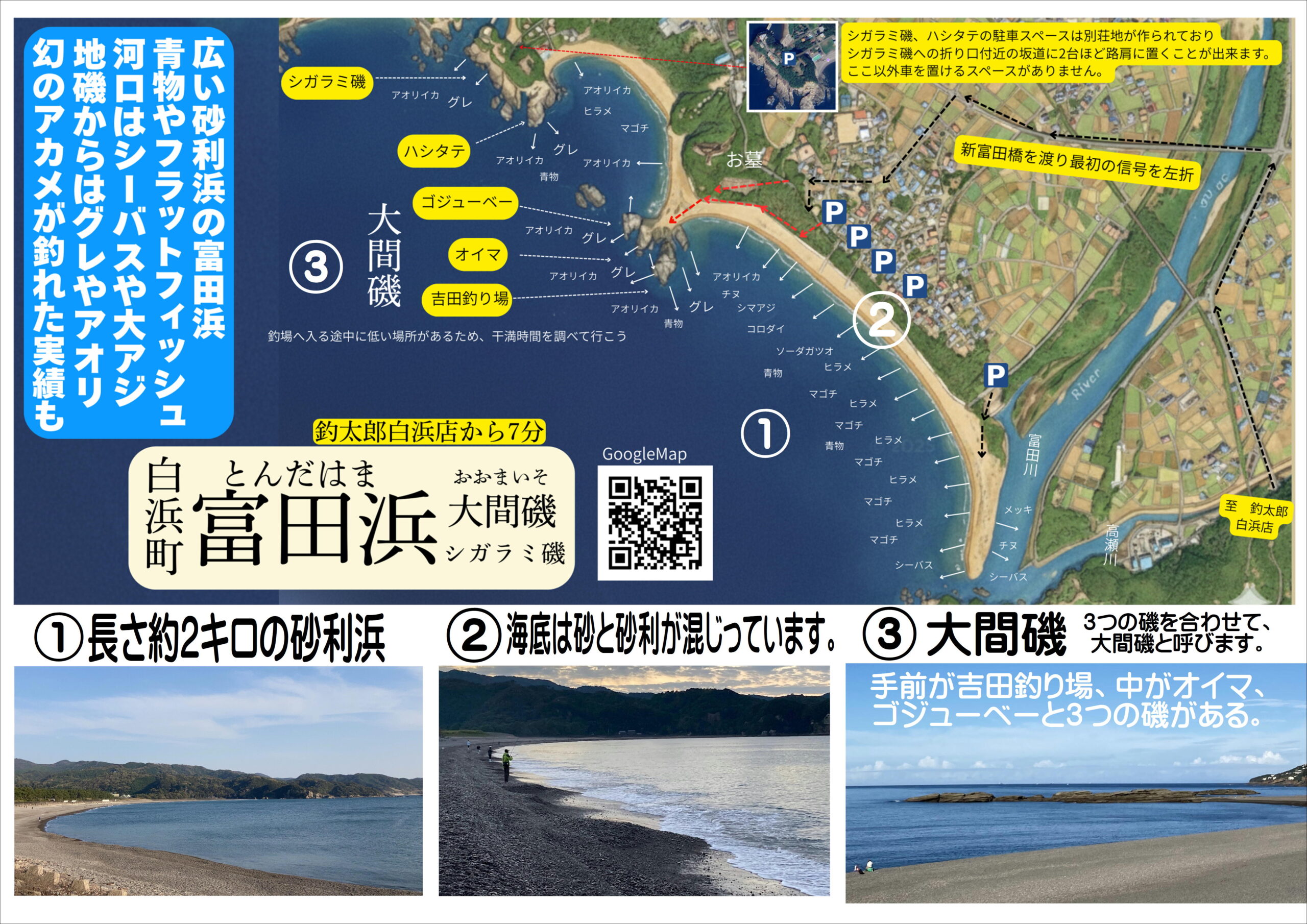 今シマアジが釣れている和歌山県白浜富田(とんだ)浜釣り場地図。 釣り場紹介 2025.11.21 南紀地方随一の青物釣り場としても有名。 ヒラスズキ、ヒラメ、コチ、アオリイカ等も釣れます。 河口付近はアジが釣れることも多い。