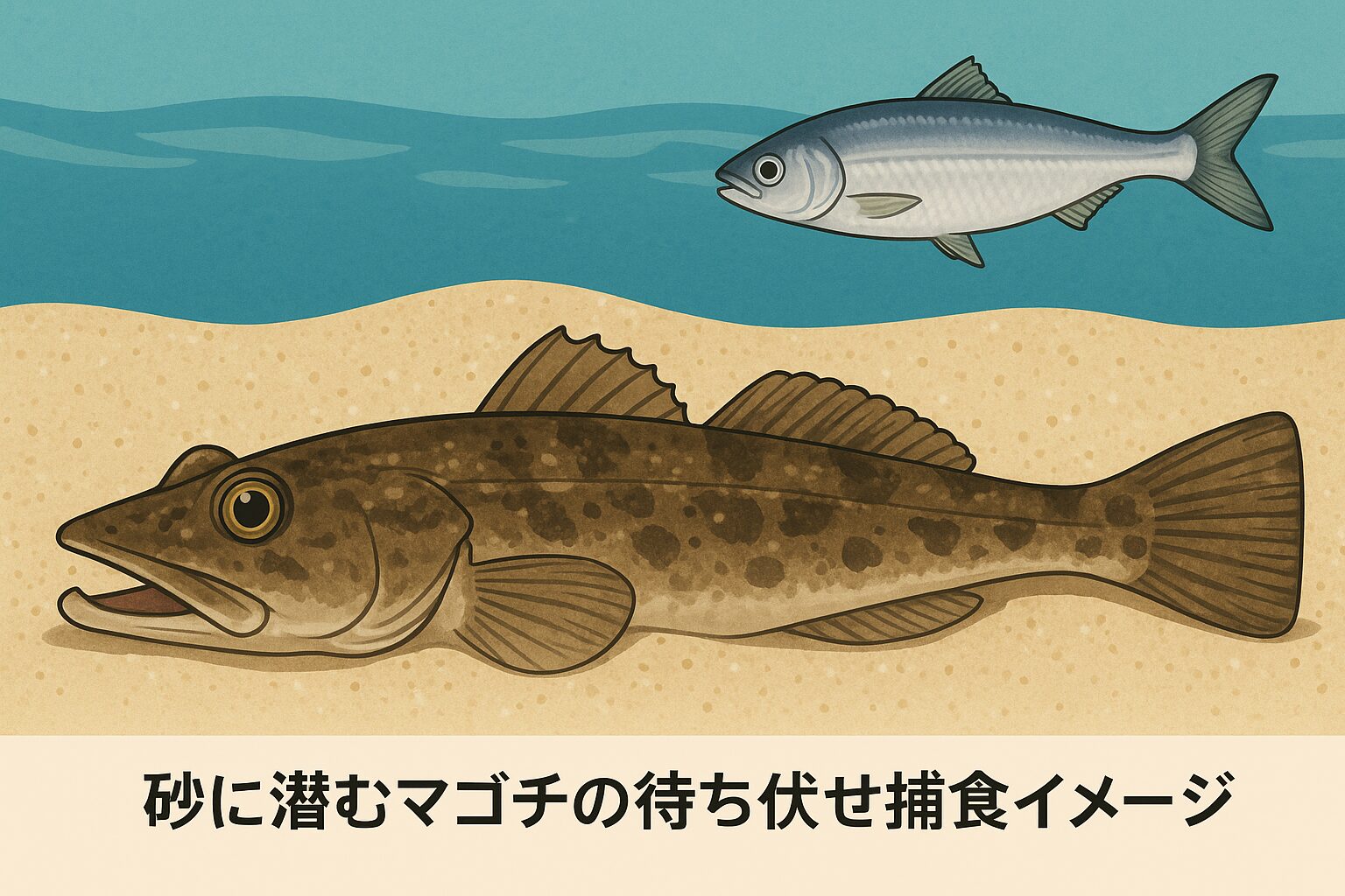 マゴチは砂に身を潜め、目だけを出しながら獲物を待ち伏せします。