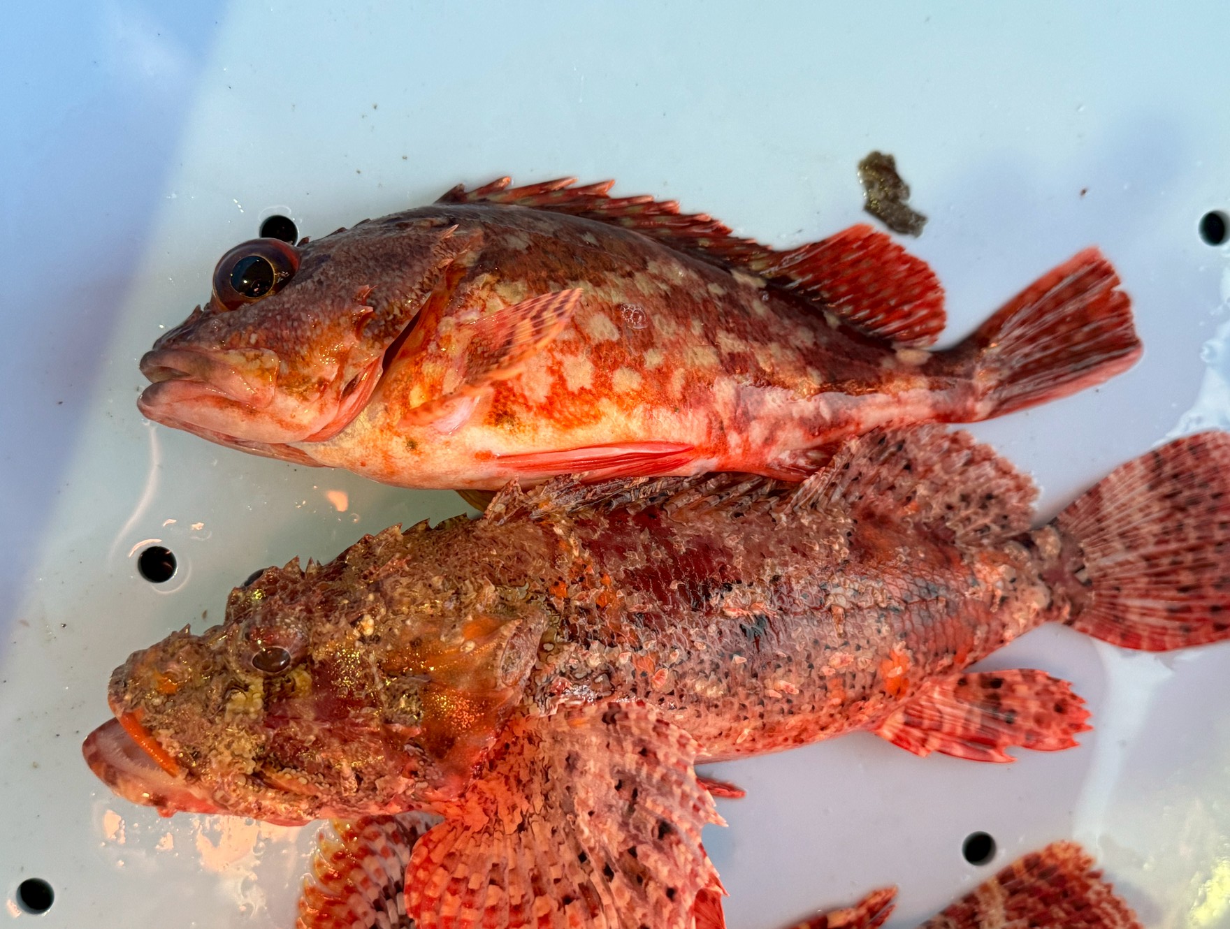 どちらも釣って嬉しい魚ですが、下の魚(オニカサゴ)が釣れた時だけは、ハリを外す際やクーラーに入れる際に細心の注意を払ってください