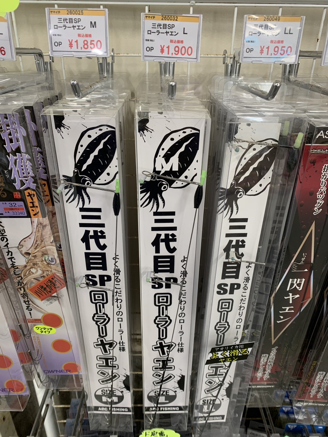 みなべ店新しいヤエンが入荷しました。【三代目SPローラーヤエン】 釣具、エサ紹介 2025.11.28 ABC 三代目 SP ローラーヤエン 底へ滑るローラーヤエン 高バランス設計 こだわりのローラー仕様でイカに達するタイミングを逃さない フックは強度、掛かり抜群! MADE IN JAPANブランド品を使用 サイズ/M/L/LL M:1850円、L:1900円、LL:1950円(税込)です。