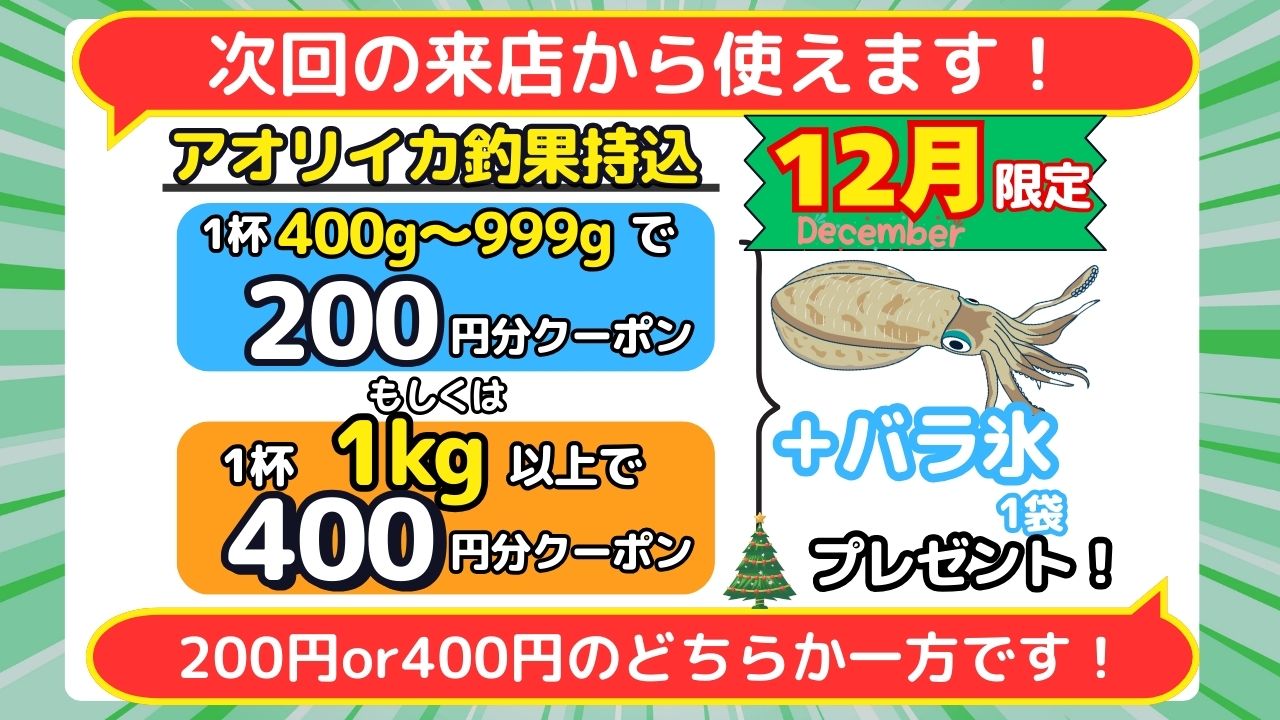 🦑🎁 12月限定!アオリイカ釣果持ち込みキャンペーン 🎁🦑