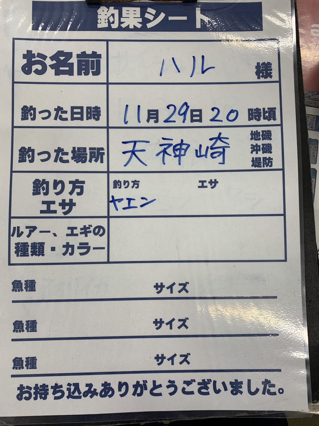 11/30 ハル様大漁!アオリイカ1198gを筆頭に計8杯4370gの釣果。天神崎でヤエン釣り。