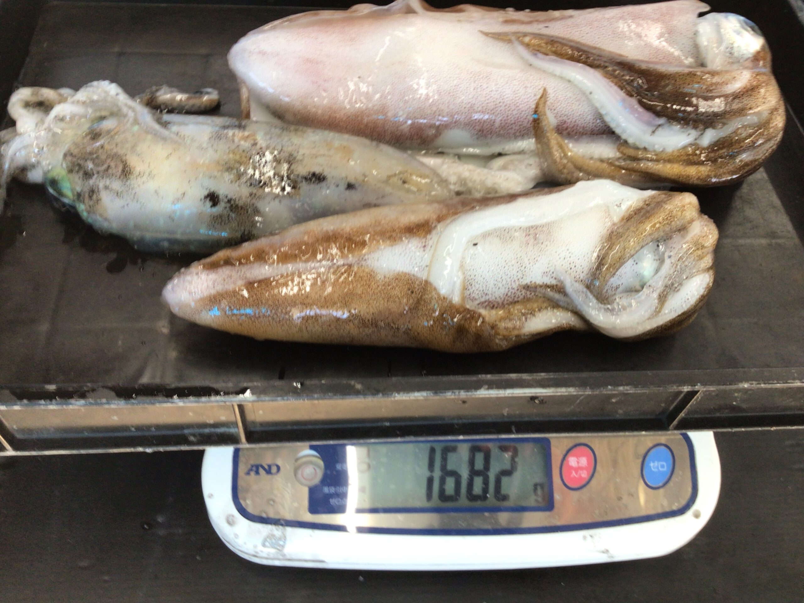 ヤエンでアオリイカ釣果、3杯で1,682g。ケンワン様。田辺天神崎にて。