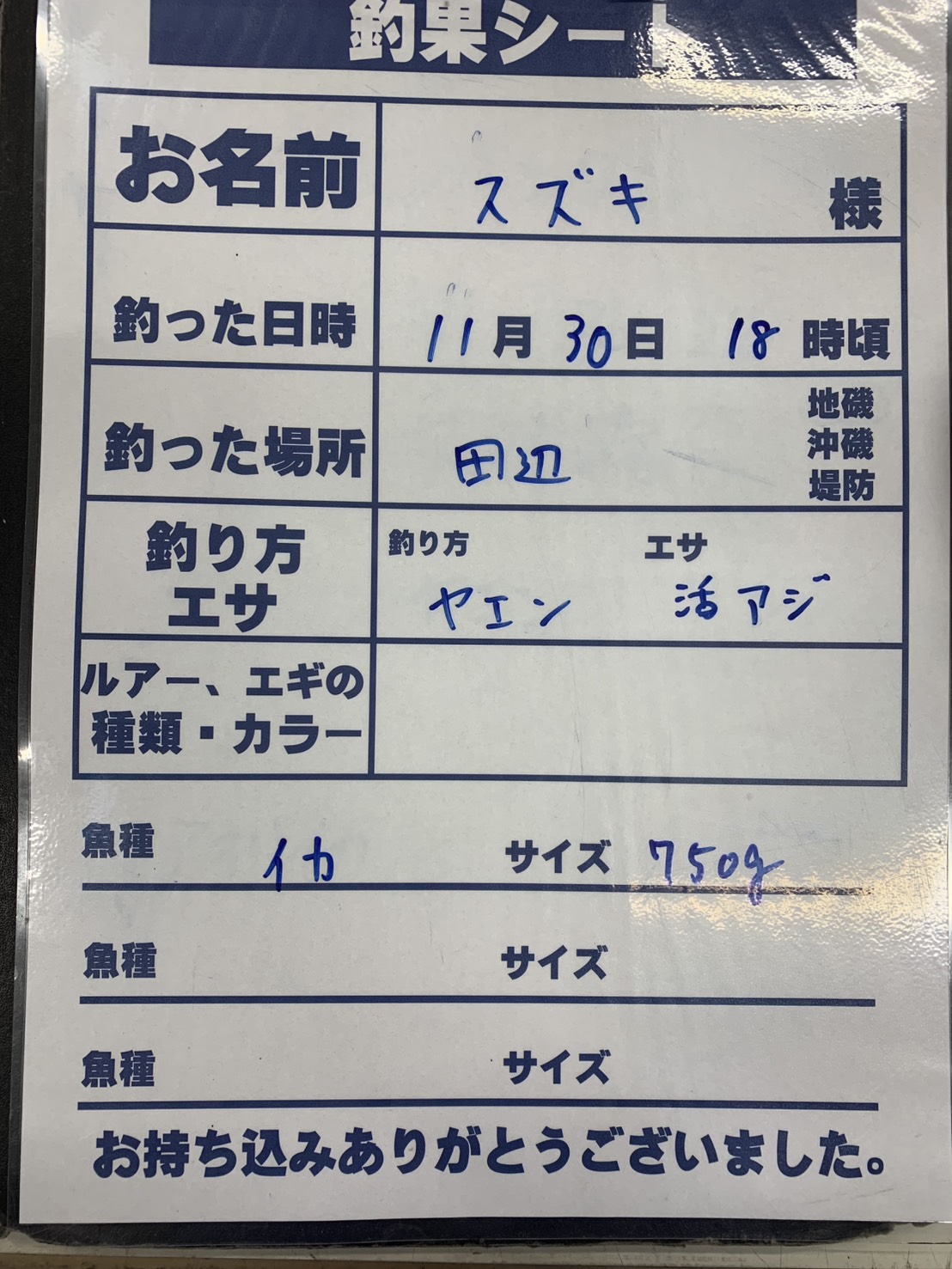 11/30 アオリイカの釣果732g 田辺でヤエン釣りです!