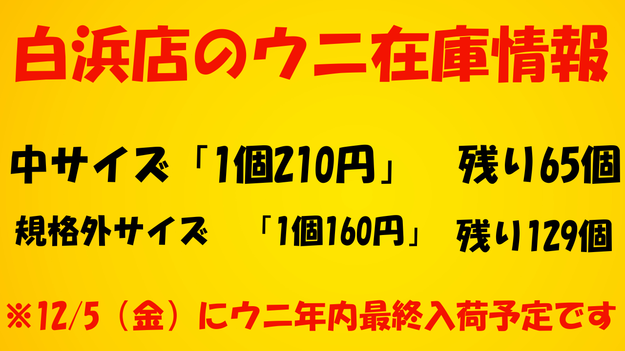 12月2日現在白浜店のウニ在庫情報※次回のウニ入荷予定日は5日の金曜日となっております。