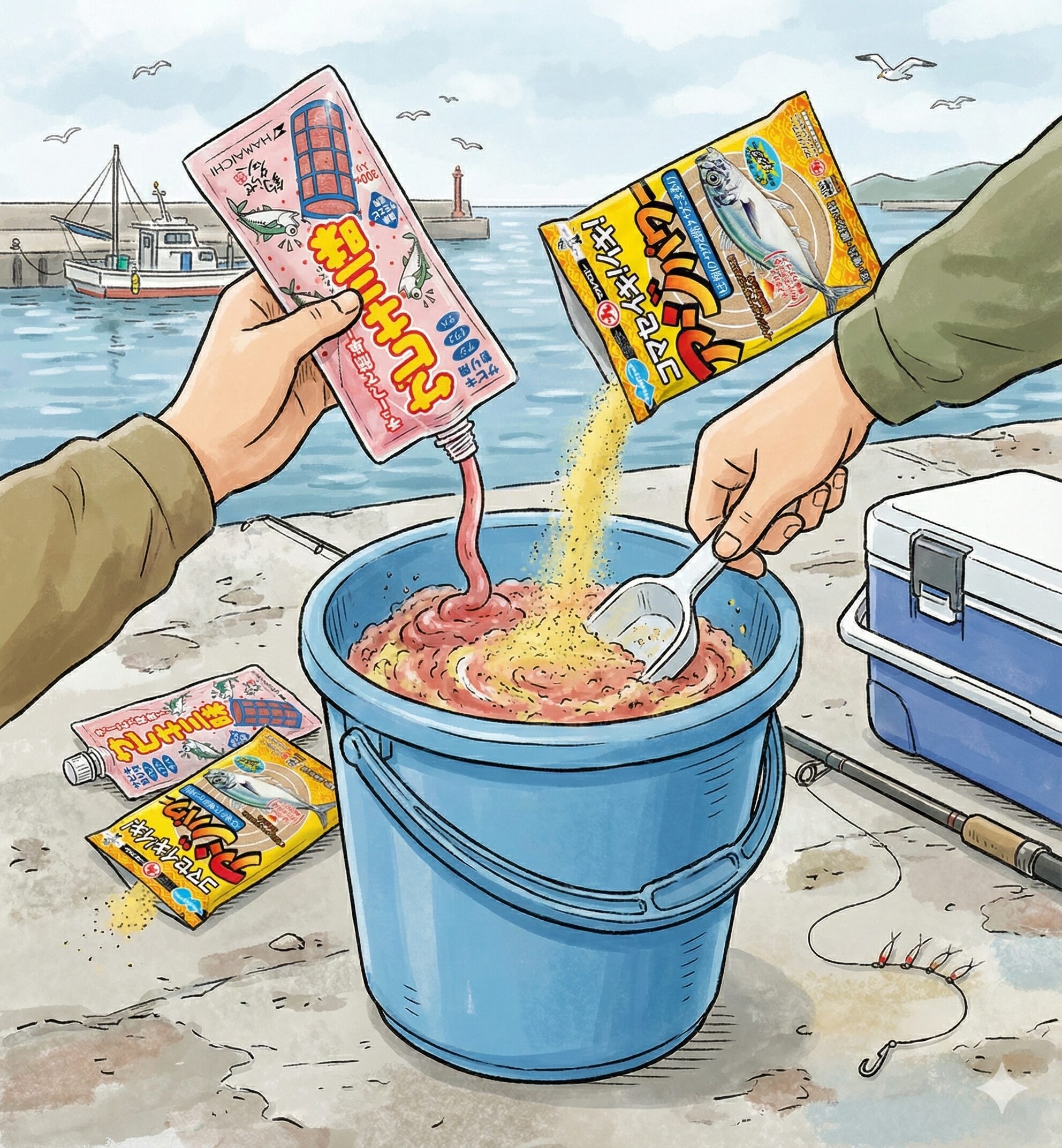 サビキ三昧800gとアジパワー500gを混ぜるだけで3~4時間はぶっこみサビキ釣りが出来ます。