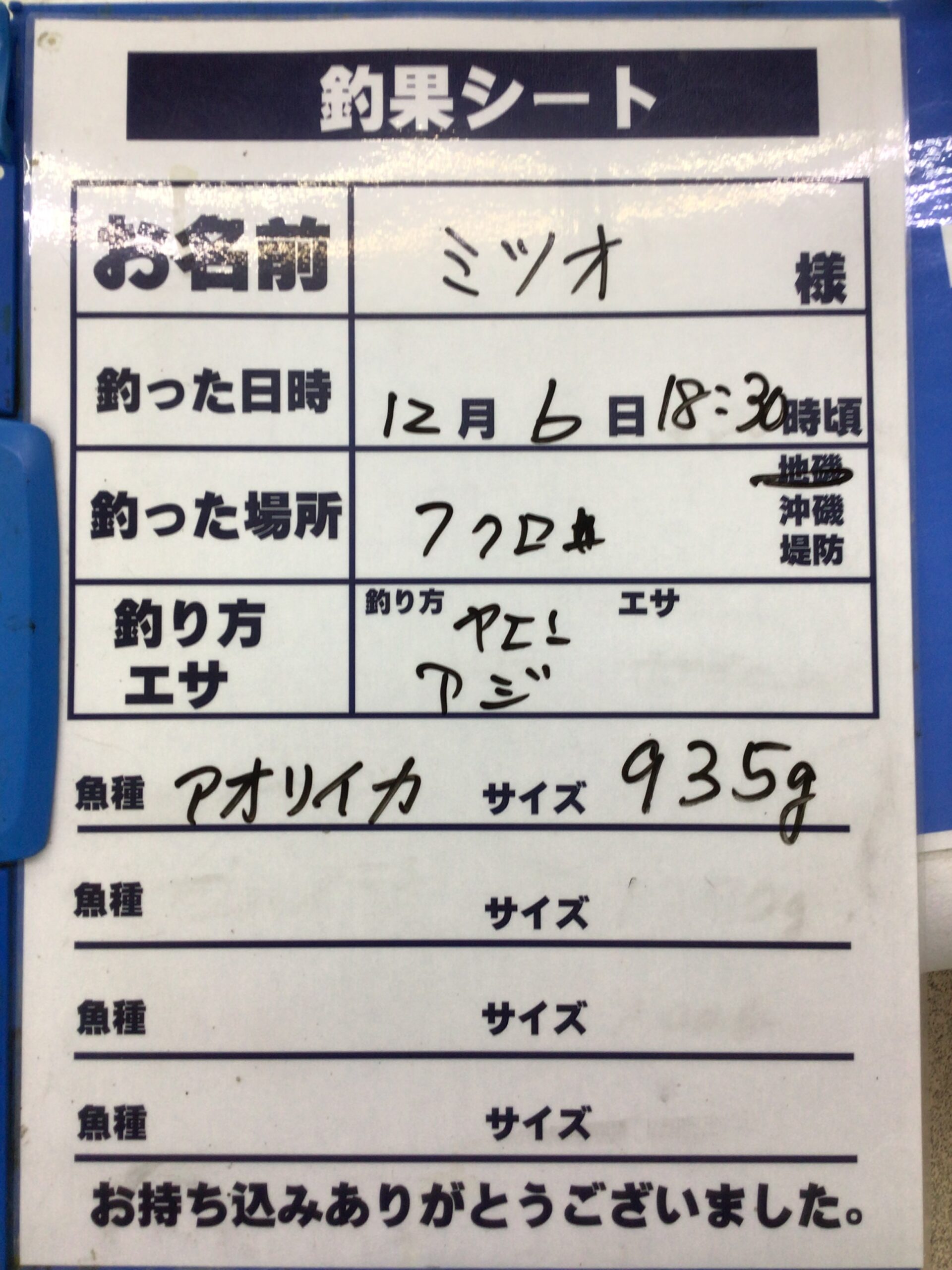 12月6日 ミツオ様 アオリイカの釣果。935g