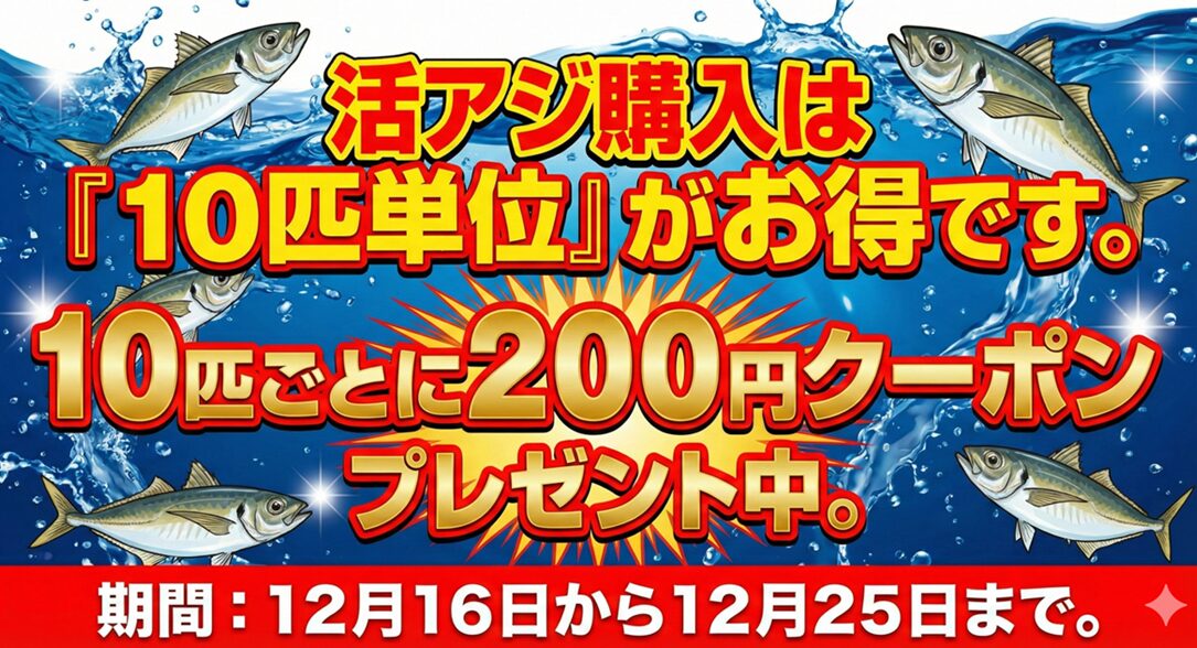 【25日まで】 活アジは10匹以上の購入がお得です!200円クーポンプレゼント。 お知らせ 2025.12.16 12月25日クリスマスまでの期間限定です。 活きアジ 10匹で200円 20匹で400円…… 10匹単位での購入が断然お得です! クーポン券はタバコ以外のほとんどの商品に使えます!