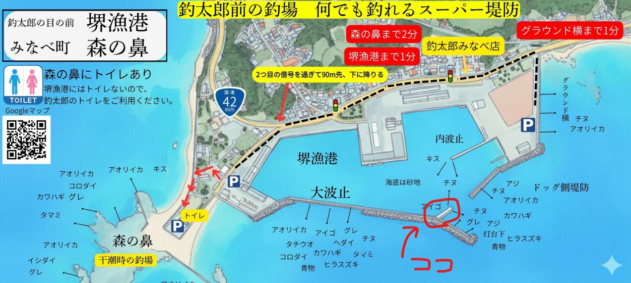 スタッフ昼休憩釣行 みなべ堺漁港 足元に13~18cmのアジ爆湧き中です! スタッフ釣行記 2025.12.22 皆さんこんにちは!釣り初心者スタッフのしばちゃんです。 みなべ堺漁港にてアジ湧いていると言う事で昼休憩に覗きに行きました。 今回使った組み合わせはコチラ サビキ三昧、優秀でした。めちゃくちゃ寄ってきました。 22日月曜日 お昼11時半からスタート 20分でこれだけ釣れました。 丸アジが多かったです、真アジもパラパラ。 サビキ6号でやりましたが結構外れちゃったので 4、5号くらいで良いかもです。 今回行った場所はここ↓ 比較的水面までの距離が短かったので、やりやすかったです。