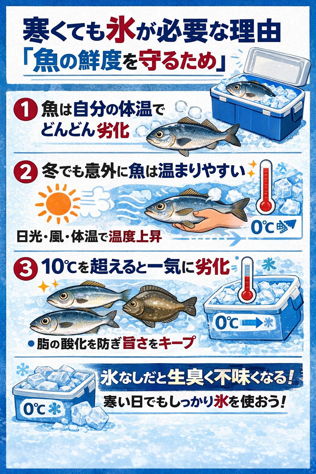 寒くても氷が欲しい理由は「気温」ではなく「魚の中で起きている劣化」を止めるためです。