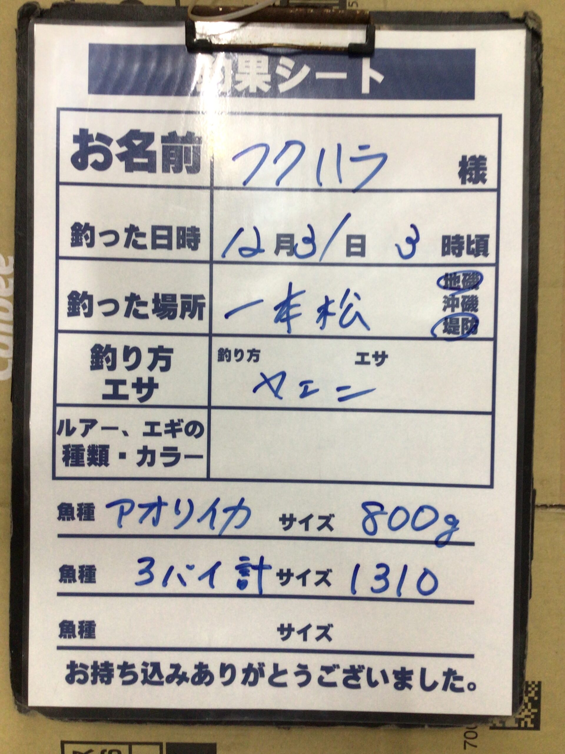 12月31日 フクハラ様 アオリイカの持込釣果。