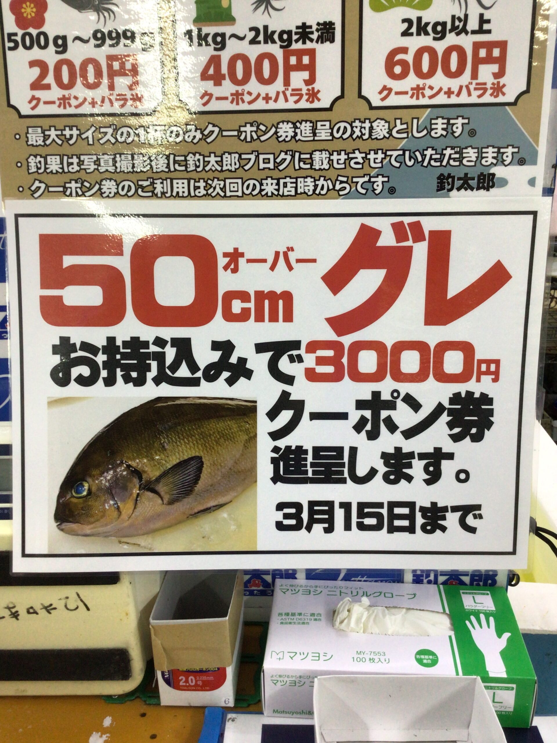 釣り人の憧れ!?グレ50センチ持ち込みで3000円クーポンプレゼント! 未分類 2026.01.11 グレの50センチ私は一度も生で見たことがないので、是非見てみたいものです!! 皆さまのお持ち込み、楽しみにお待ちしております!! 私も、少しの希望を抱きながら狙ってみようと思います(笑)