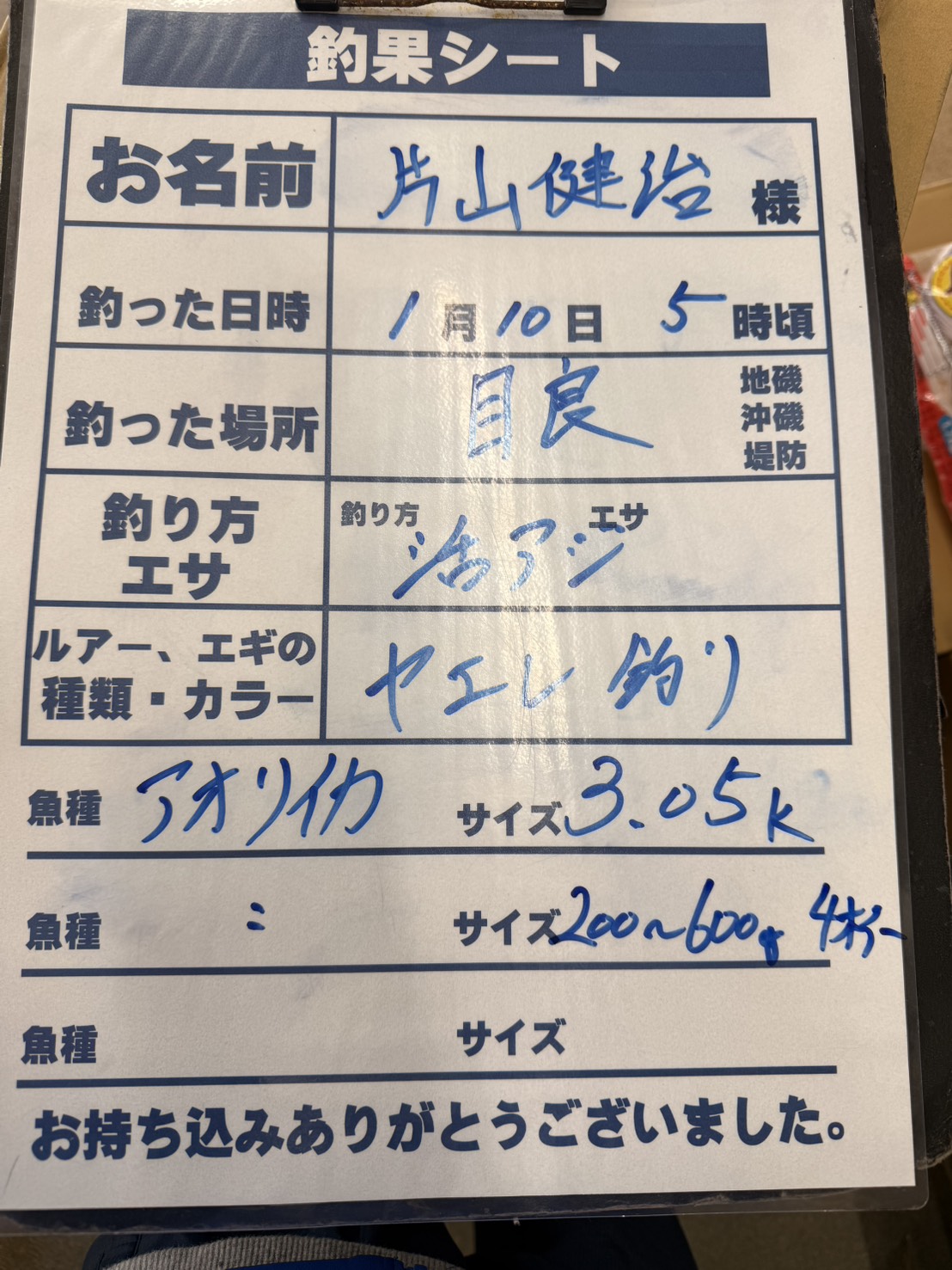 1/10 この時期にこんなサイズが見れるなんて!ヤエン釣りでアオリイカ3キロ越えの持込釣果いただきました!