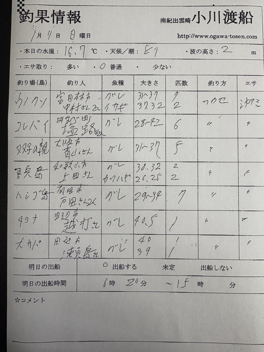 1/11渡船釣果です。明日も出船予定です。 お知らせ 2026.01.11 明日は雪が降る可能性。 北部から来られる際は、お気をつけてお越しください。 エサの解凍はネットや電話で出来ますので、お待ちしております。