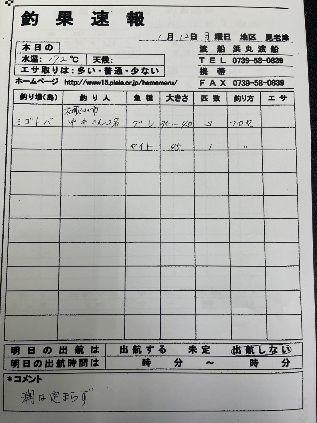 すさみ町の浜丸渡船さんは明日1/13日は、休船日です