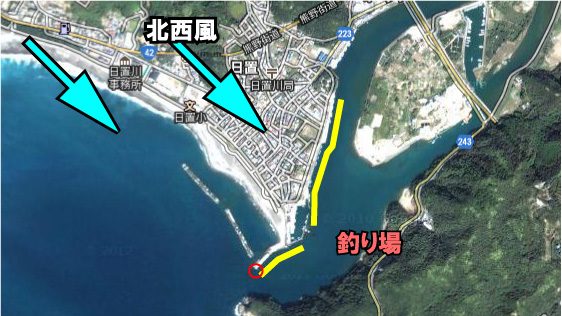 日置川河口の護岸は川全体の底は、橋の下までほとんど海と同じ。赤丸周辺ではアオサで巨グレが狙える。…夕方で満ち潮時が狙い目。