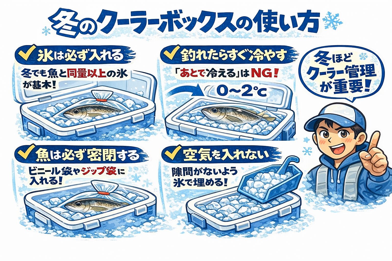 また、魚の鮮度を保つには「低温で安定させる」ことが重要。そのため、冬でもクーラーボックスは欠かせません。