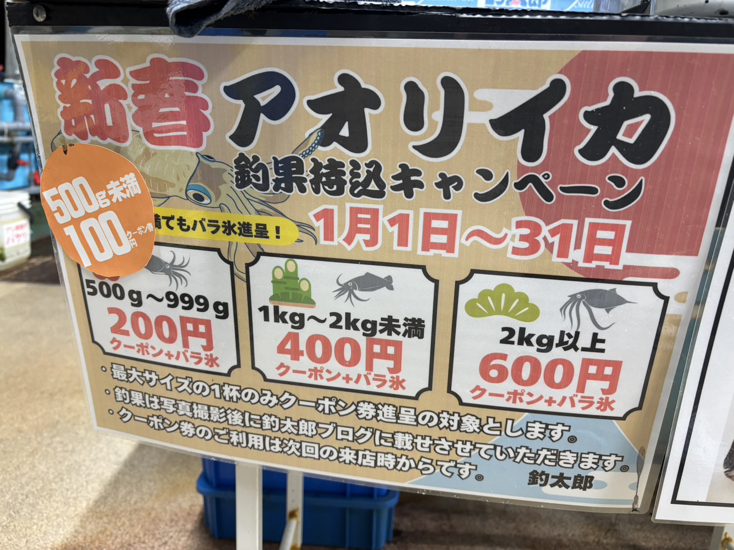 アオリイカ 釣果持込キャンペーン実施しています! お知らせ 2026.01.23 アオリイカ釣果持込キャンペーン実施中です。 釣果は写真撮影後に釣太郎ブログに載せさせていただきます。 たくさんの持込お待ちしております。
