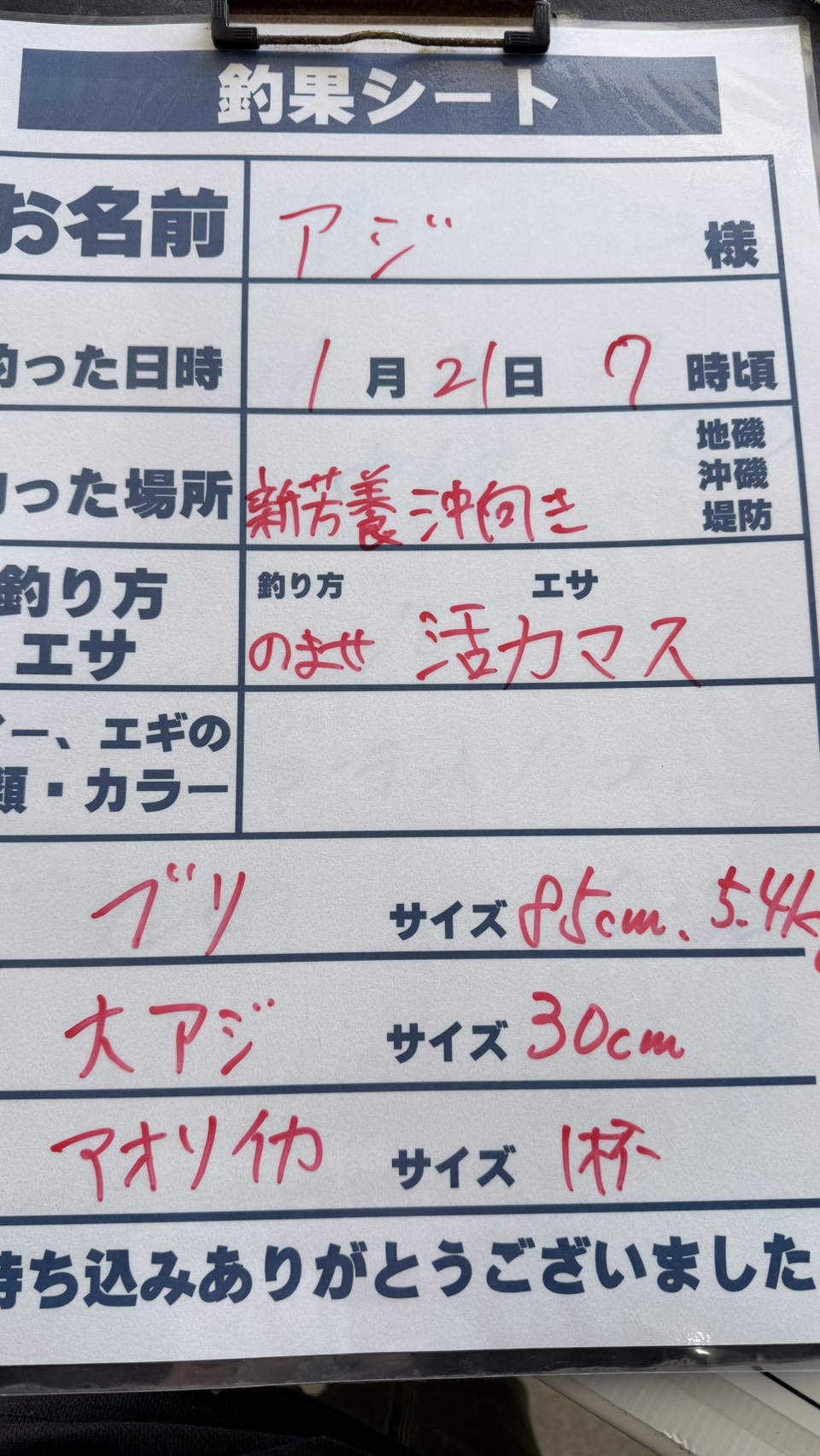 1/21田辺新芳養漁港にて、釣ったカマスの泳がせでブリ85㎝、5.4キロと尺近いアジとアオリイカの釣果
