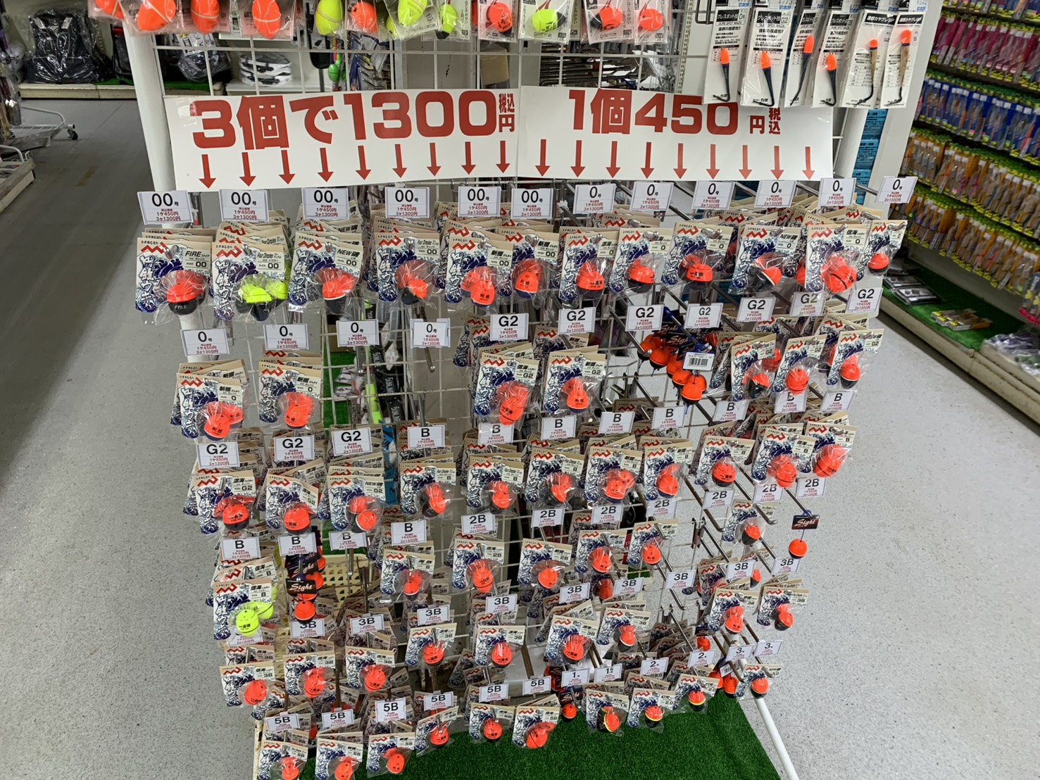 玉ウキは、3個まとめ買いで50円お得になります。6個だと100円お得に。