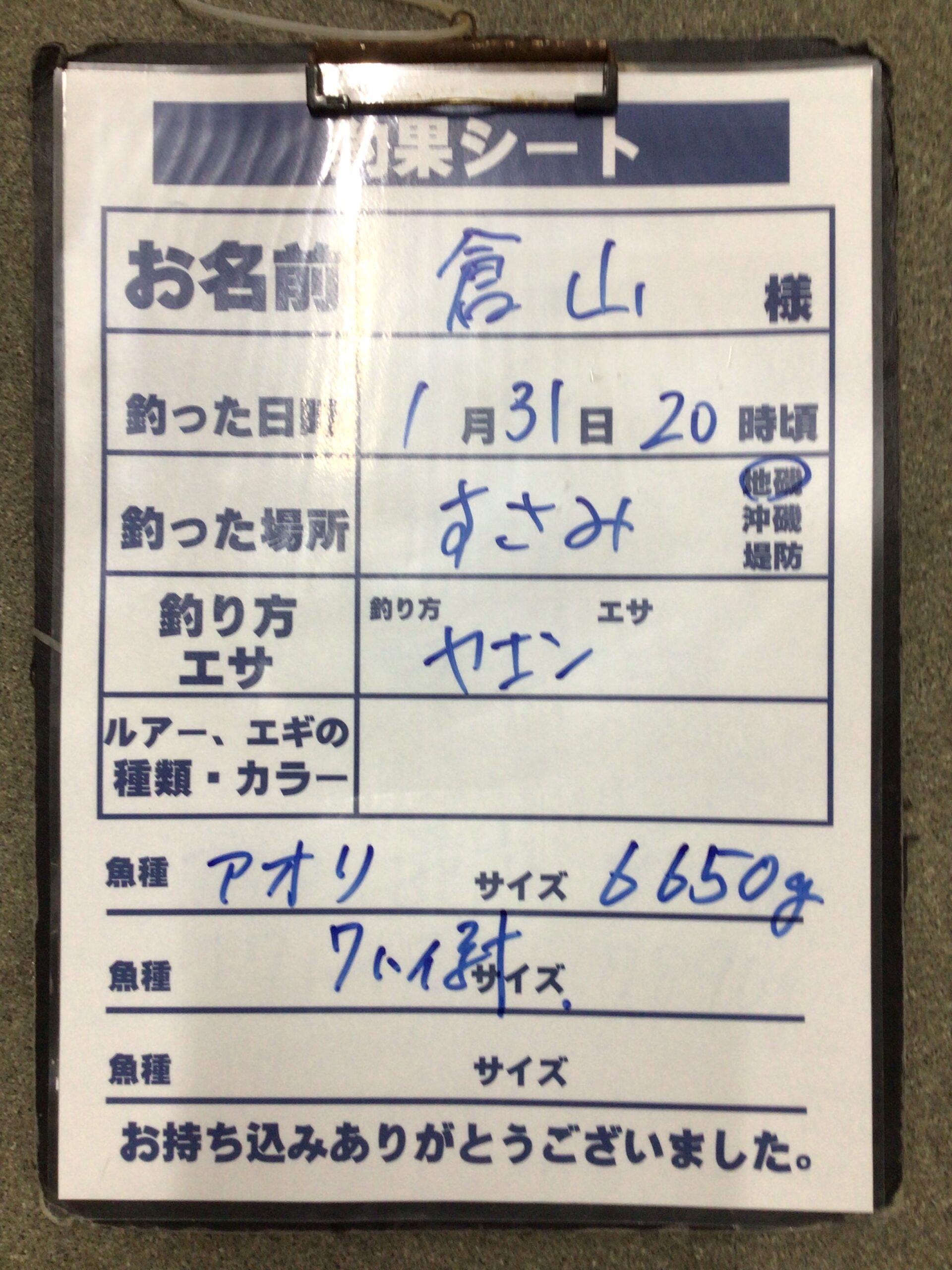 1月31日 倉山様 アオリイカ 7杯6650g。