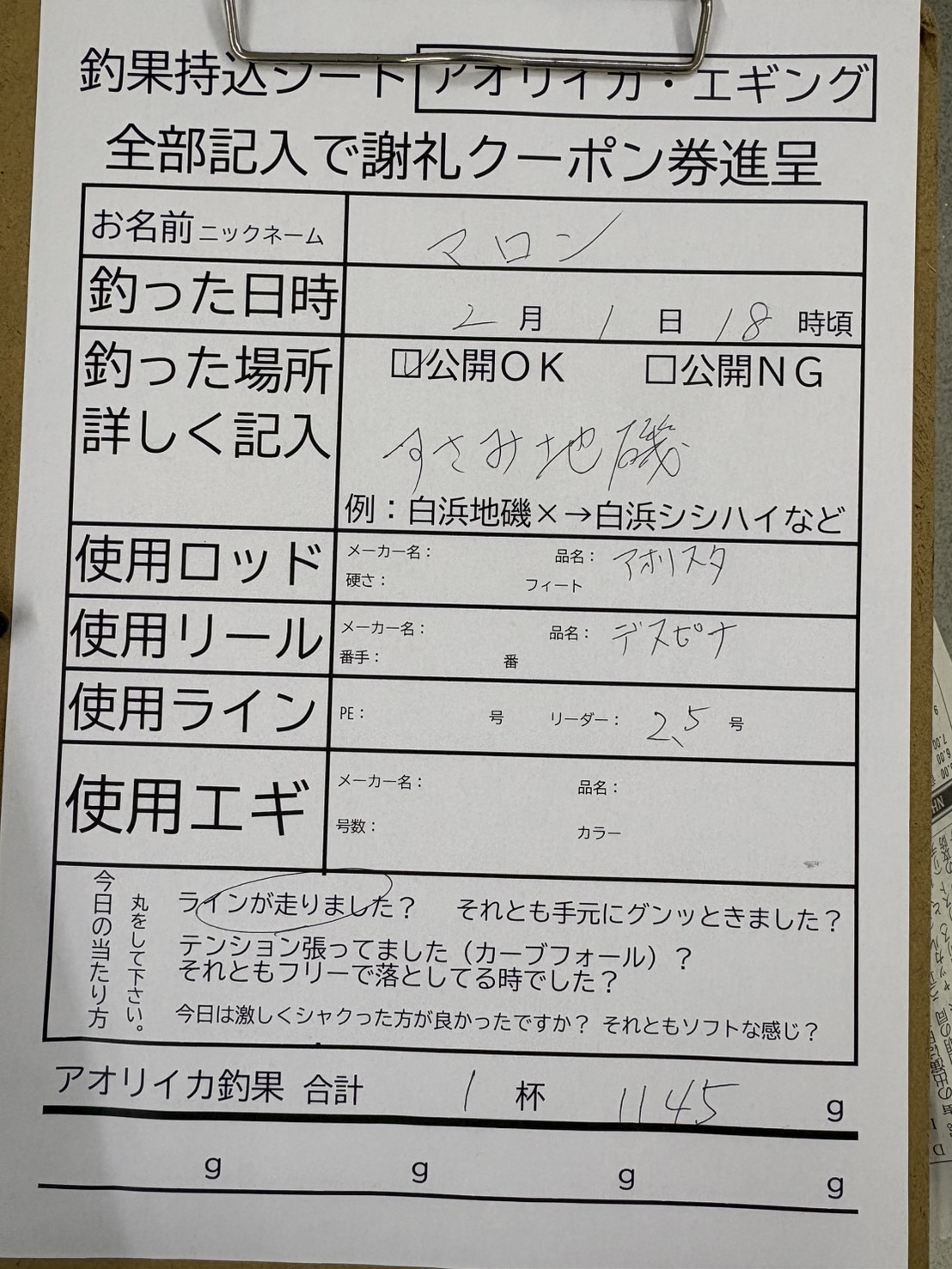 2/1 アオリイカの釣果 1145g すさみ地磯、ヤエン釣りにて イカ釣果 2026.02.01 釣果持込シート【アオリイカ・エギング】全部記入で謝礼クーポン券進呈 お名前(ニックネーム)マロン 釣った日時2月 1日 18時頃 釣った場所公開OK 詳しく記入すさみ地磯(本人より詳細秘密) 使用ロッドメーカー名:品名:アオリスタ硬さ:フィート: 使用リールメーカー名:品名:デスピナ番手: 使用ラインPE: 号リーダー:2.5号 今日の当たり方ラインが走りました アオリイカ釣果 合計1杯 1145g