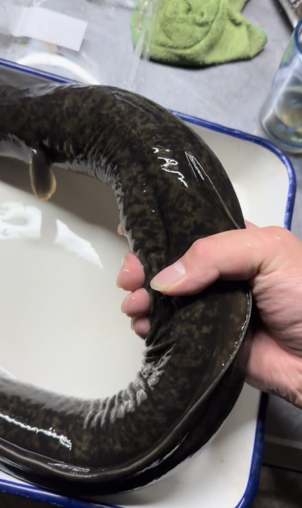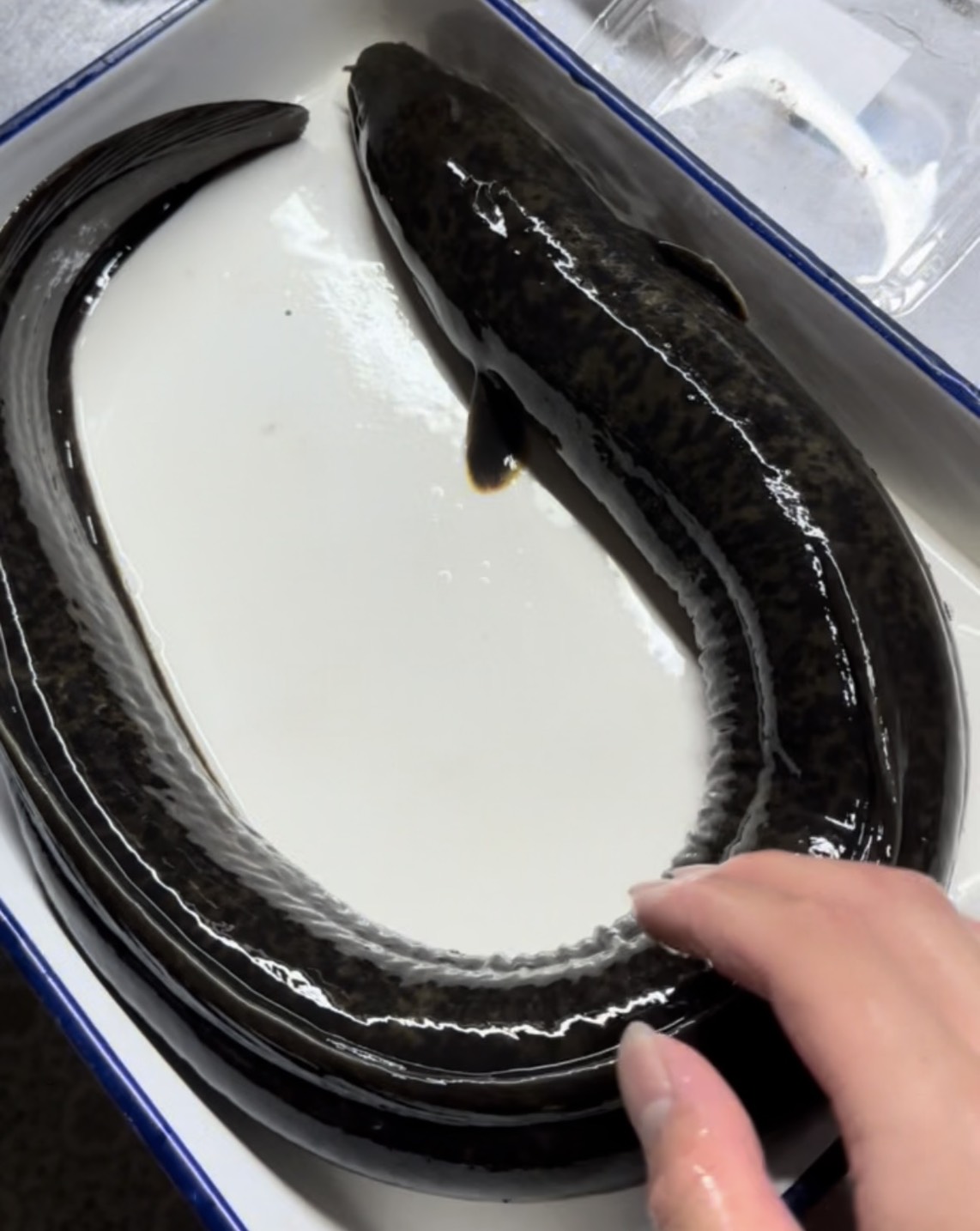夜に川で出合ったオオウナギ、穴釣りでかかった一匹この個体は70㎝程でしたが