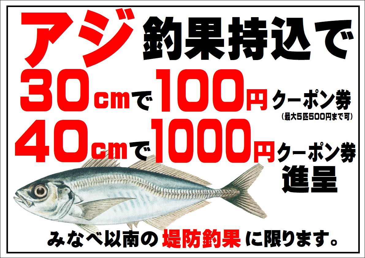 堤防で尺アジが釣れたら店頭へお持ち込み下さい。クーポン券進呈します。 お知らせ 2026.02.12 みなべ以南の堤防アジ釣果持込 30cmで100円クーポン 40cmで1000円クーポン進呈します! 釣果はブログにてご紹介させていただきます。