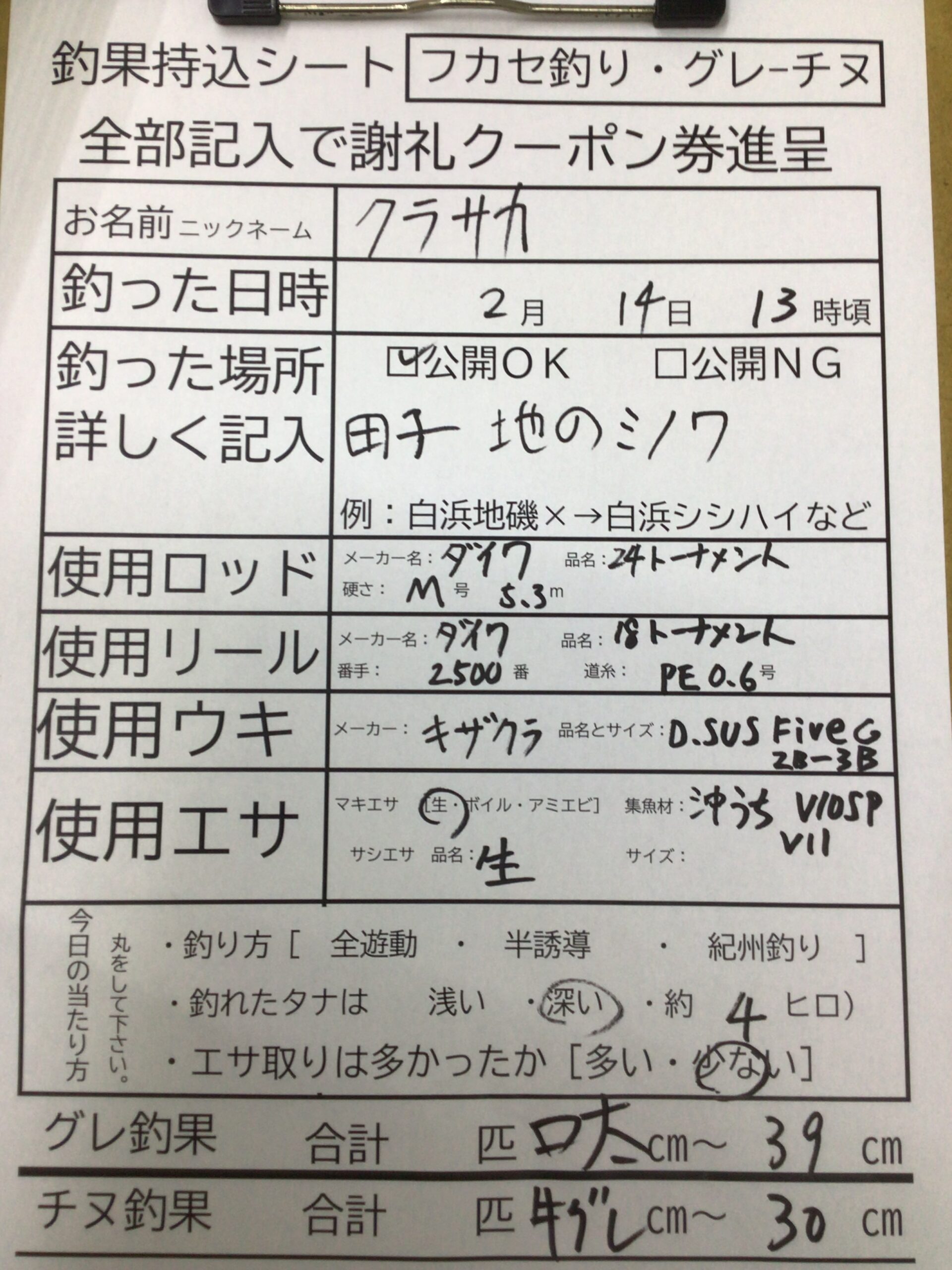 2/14串本田子沖磯でグレ39cmとウシグレ30cmのフカセ釣り釣果