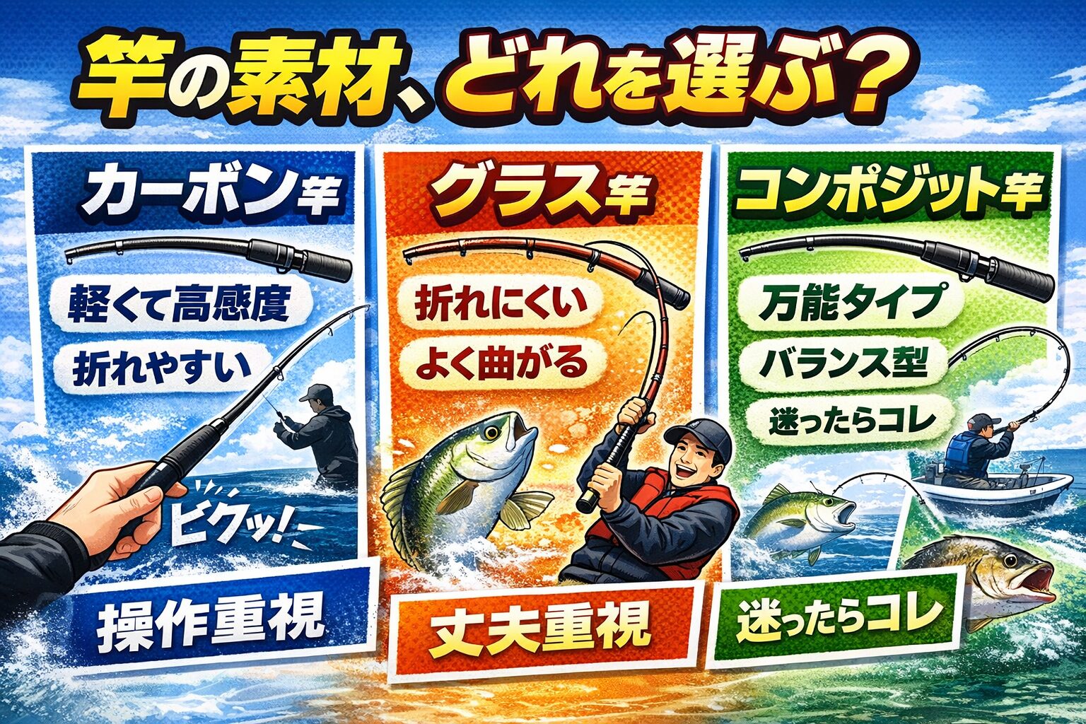 竿の素材が違うと、感度・強さ・重さ・曲がり方・扱いやすさが大きく変わります。