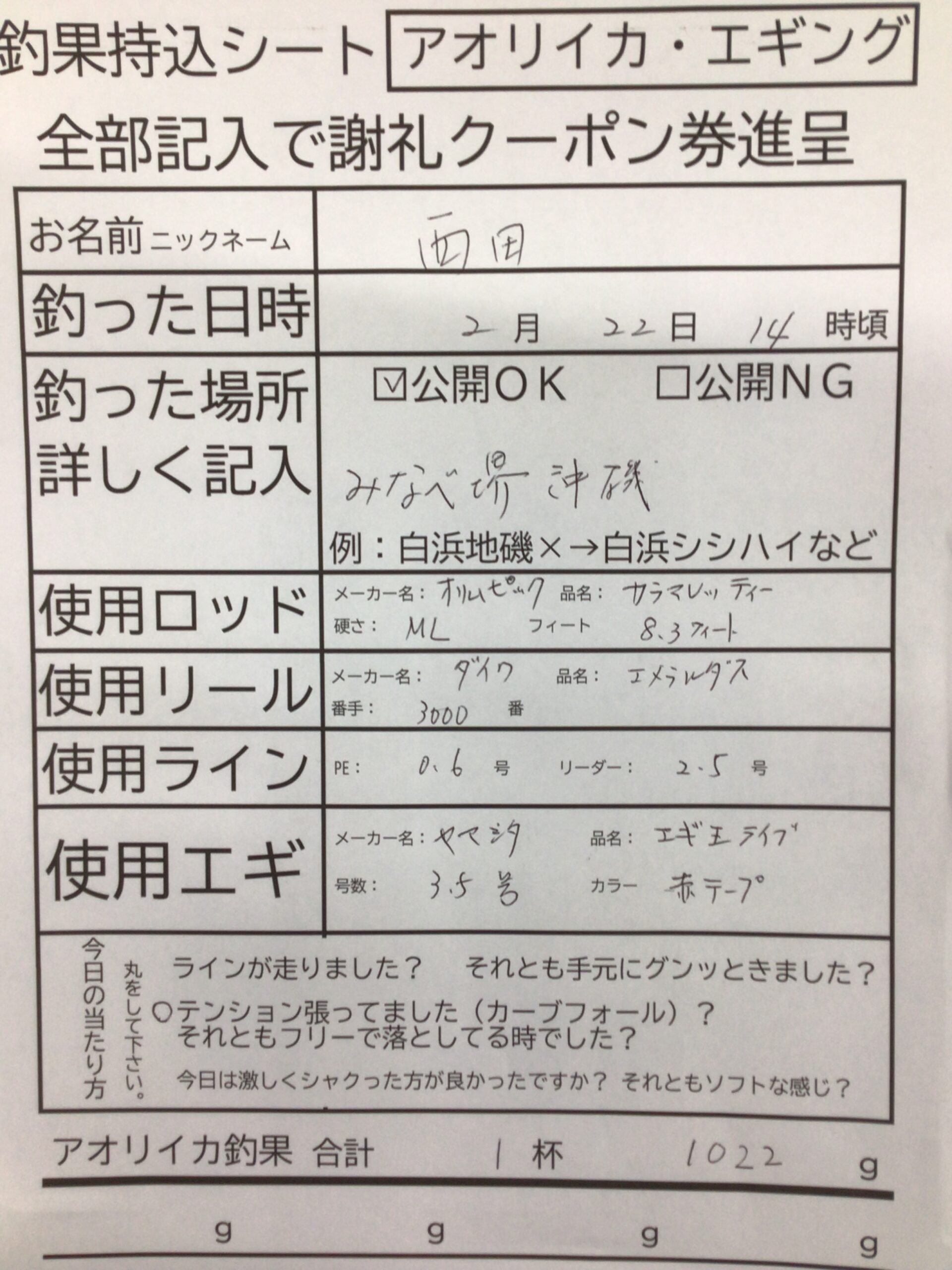 2/22(日)西田様 みなべ堺沖磯にてアオリイカ1022g! エギングにて