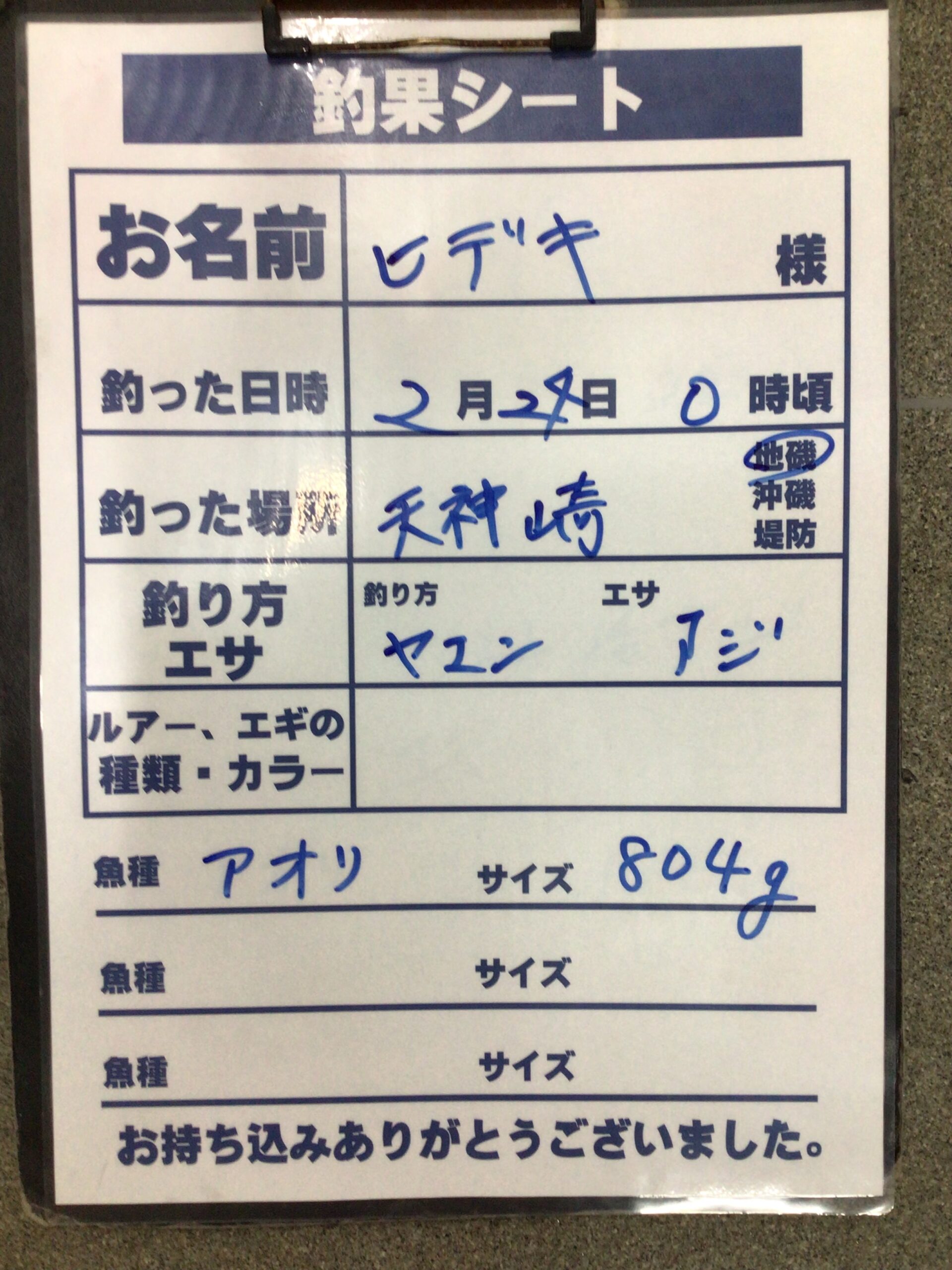 2月24日 ヒデキ様 アオリイカの釣果。804g