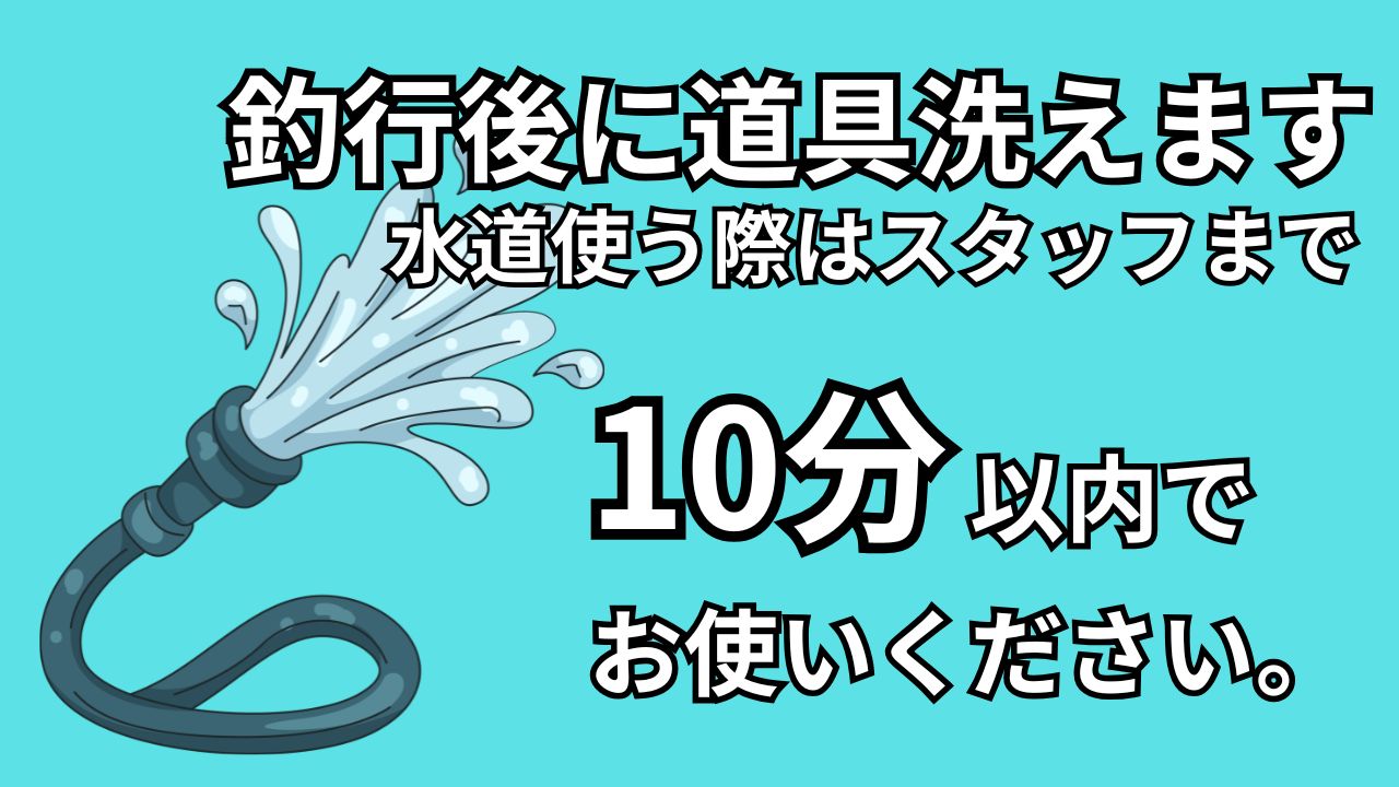 釣太郎で買い物された方は、釣行後に店外の水道で道具を洗えます。10分以内でご使用ください。