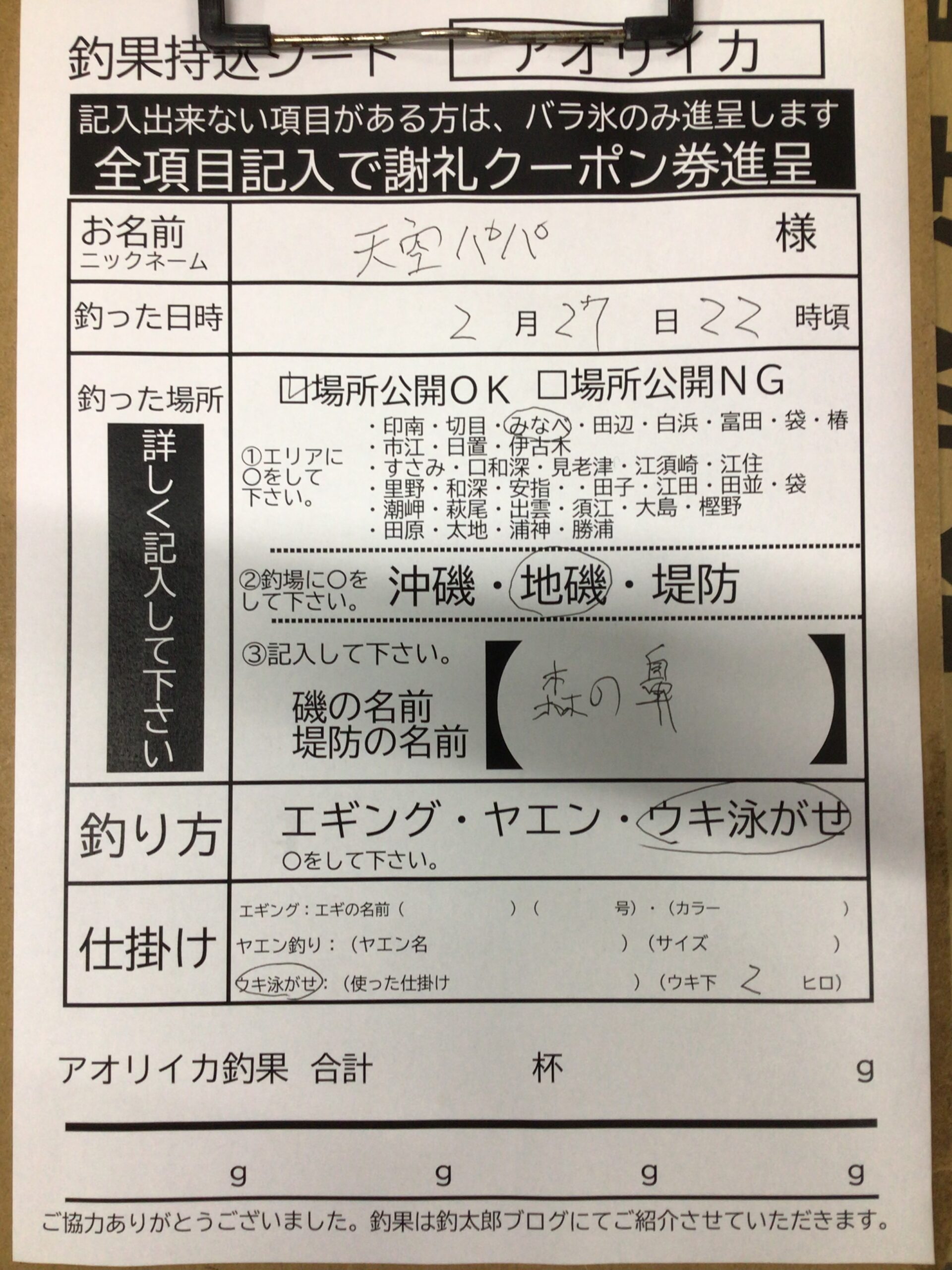 2/27 森の鼻地磯にてアオリイカの持込釣果。